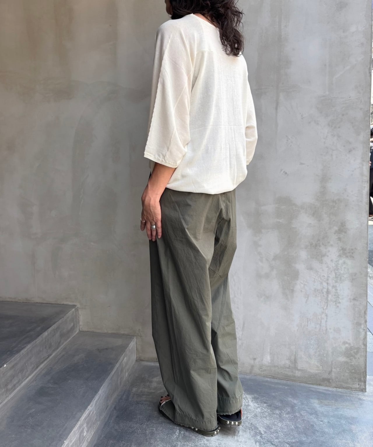 柔らかなニット素材を使用したドルマンシルエットのTシャツです。ゆったりとした着心地と独自のデザインは、デイリースタイルにぴったりなアイテムです。カジュアルにも、少しきれいめにもスタイリングできるのが魅力です。カラーはオフホワイト、ピンク、モカブラウン、ブラックの4色になります。