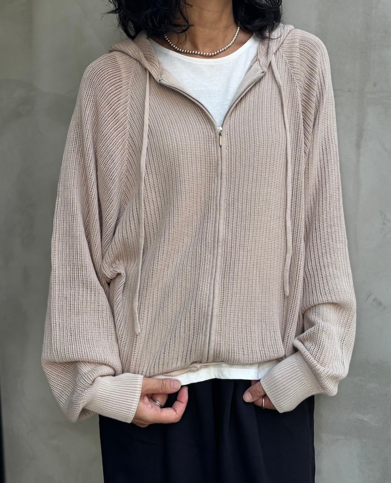 秋にかけての残暑がある時期にぴったりな透かし編みのニット。秋を感じれるデザインやカラーで透かし編みになっているので涼しく着ていただけます。同シリーズのプルオーバーもございます。カラーはサンド、グリーン、ブラウン、ブラックの4色になります。