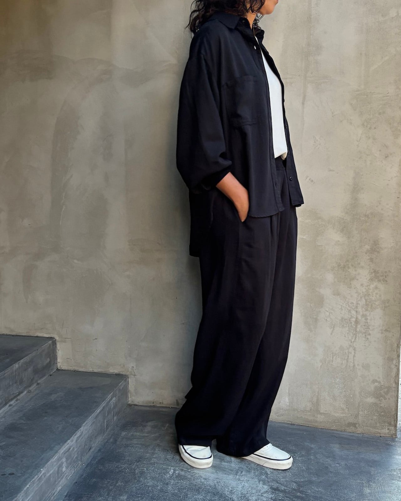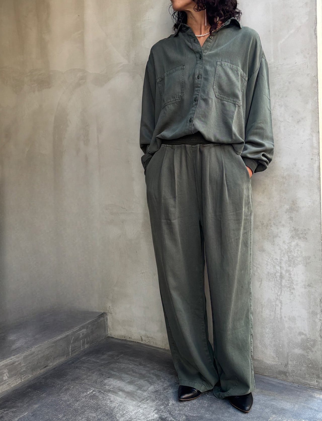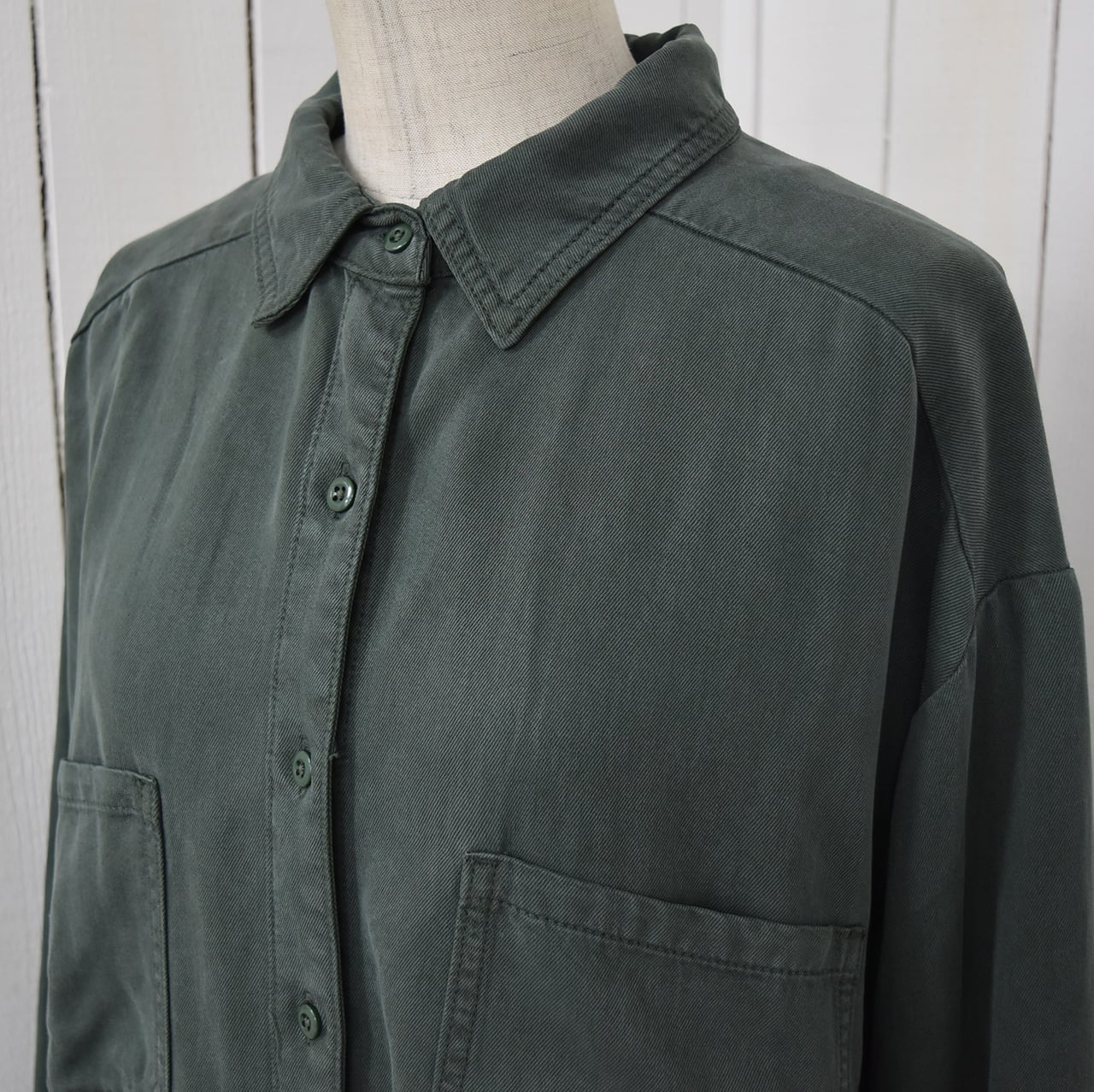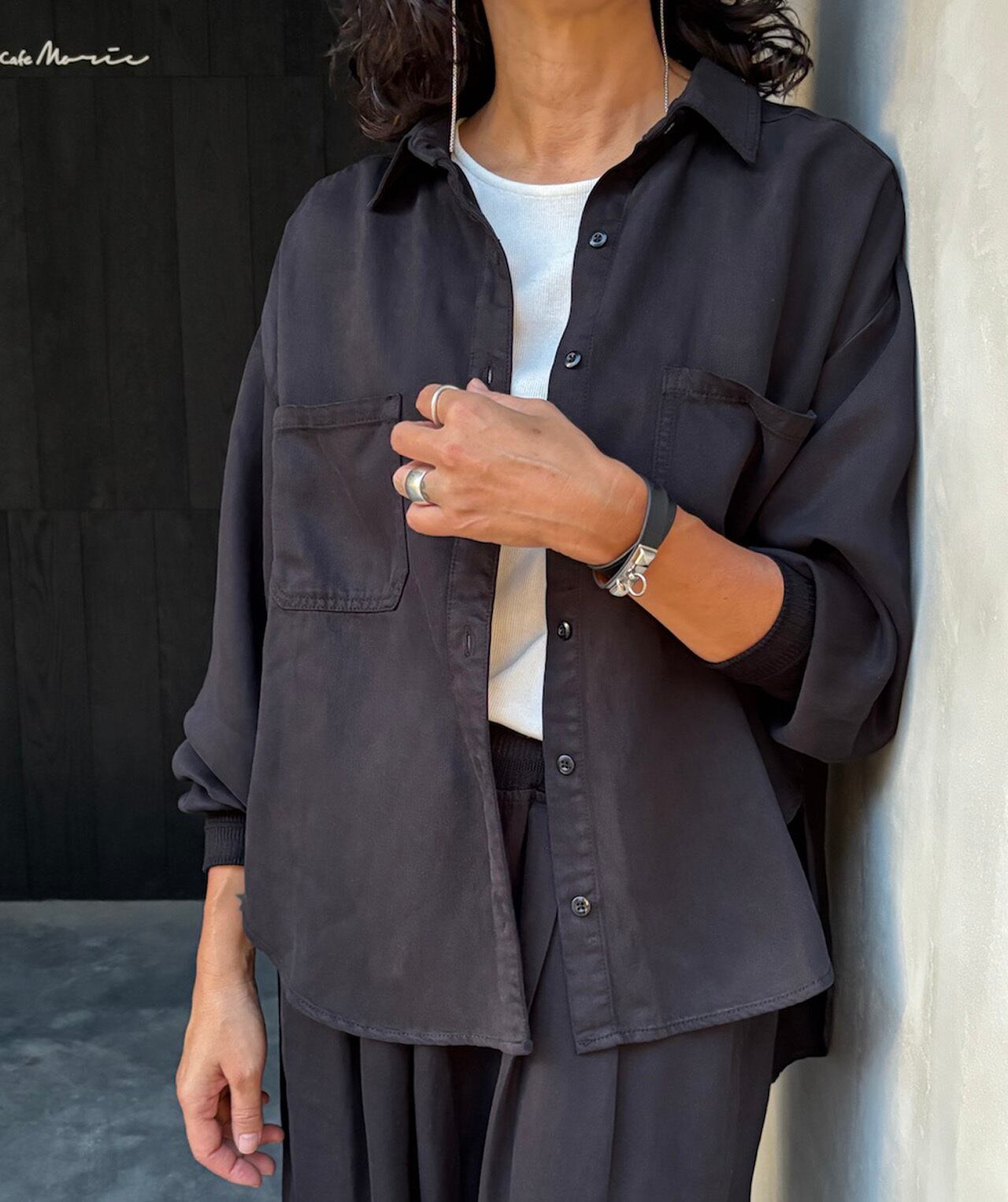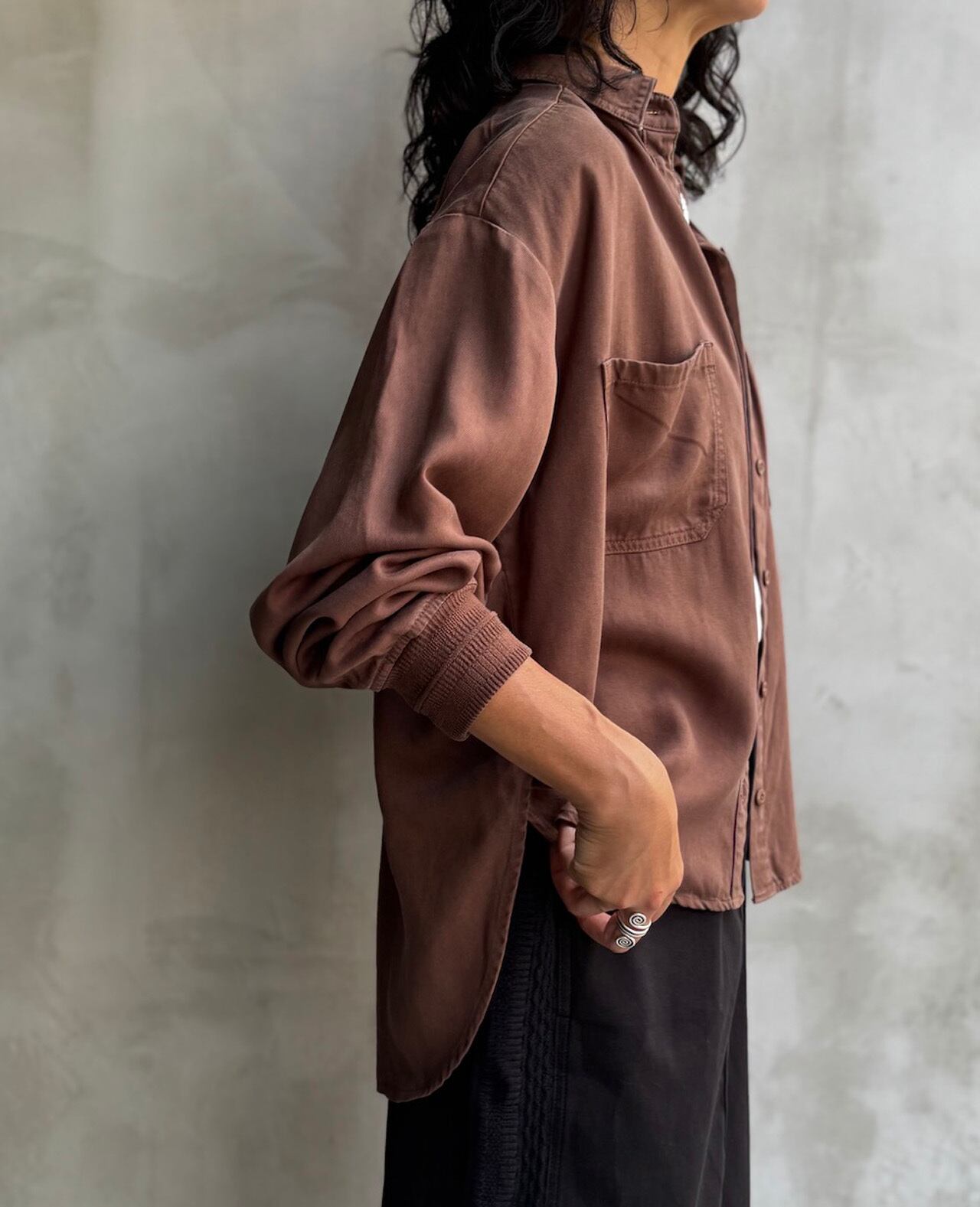 シャツとしてはもちろんこれからの時期の羽織りとしても重宝するテンセルシャツです。袖口のテンセルニットもポイントになっています。同素材のパンツとセットアップで着ていただけます。カラーはサンド、ダークグリーン、ダークブラウン、ブラックの4色になります。