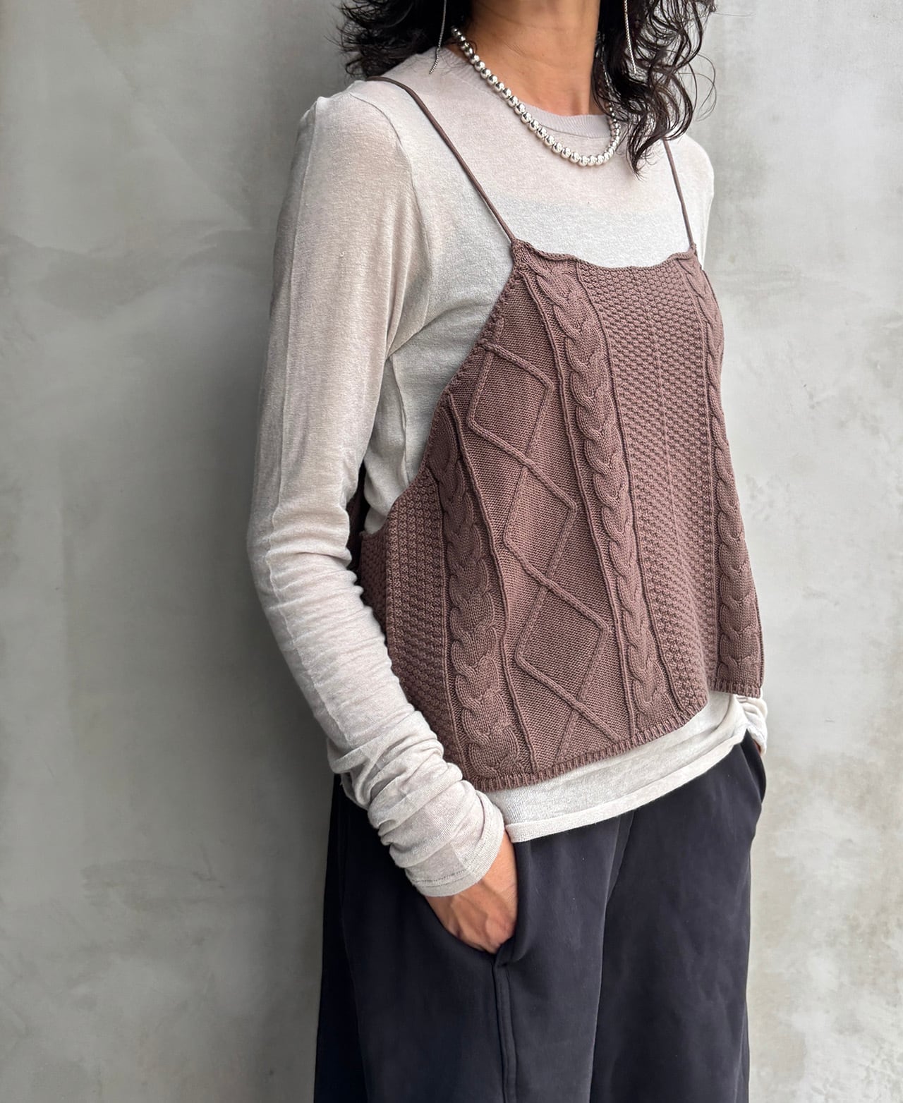 コーディネートのアクセントになるニットキャミソール。Tシャツやシャツにレイヤードするだけでいつもと違う印象に!幾何学模様とケーブル柄の2種類でカラーはサンド、ダークブラウン、ブラックの3色になります。