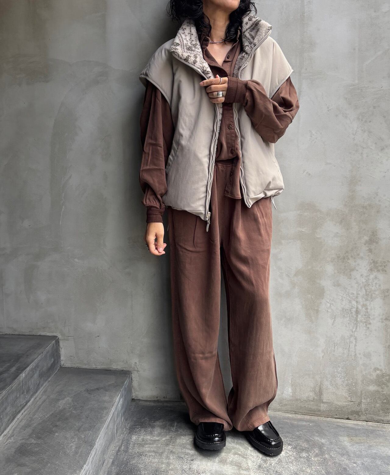 スタンドカラーのボア×ナイロンのリバーシブルベスト。ドロップショルダーで肩まで覆われていますので暖かさも◎。ボアとナイロンで表情が変わりますのでコーディネートに合わせて着こなせます。オフ、ダークブラウンの2色になります。
