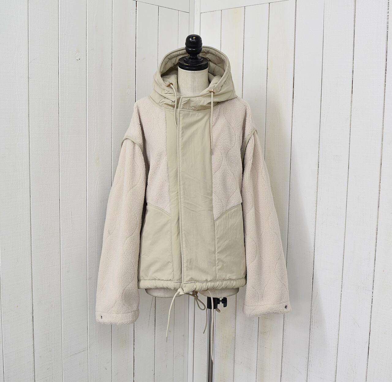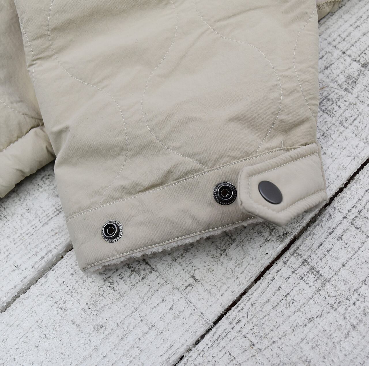 キルティングナイロン×ボアのリバーシブルジャケット。ヒップが隠れるくらいの丈感で少しAラインよりの形になっておりますが裾にドローコードが入っていますので絞って丸いシルエットにしても可愛く着ていただけます。ボア側にはバックプリントのロゴが入りシンプルになりがちな冬のコーディネートのポイントになってくれます。オフ、モカ、ブラックの3色になります。