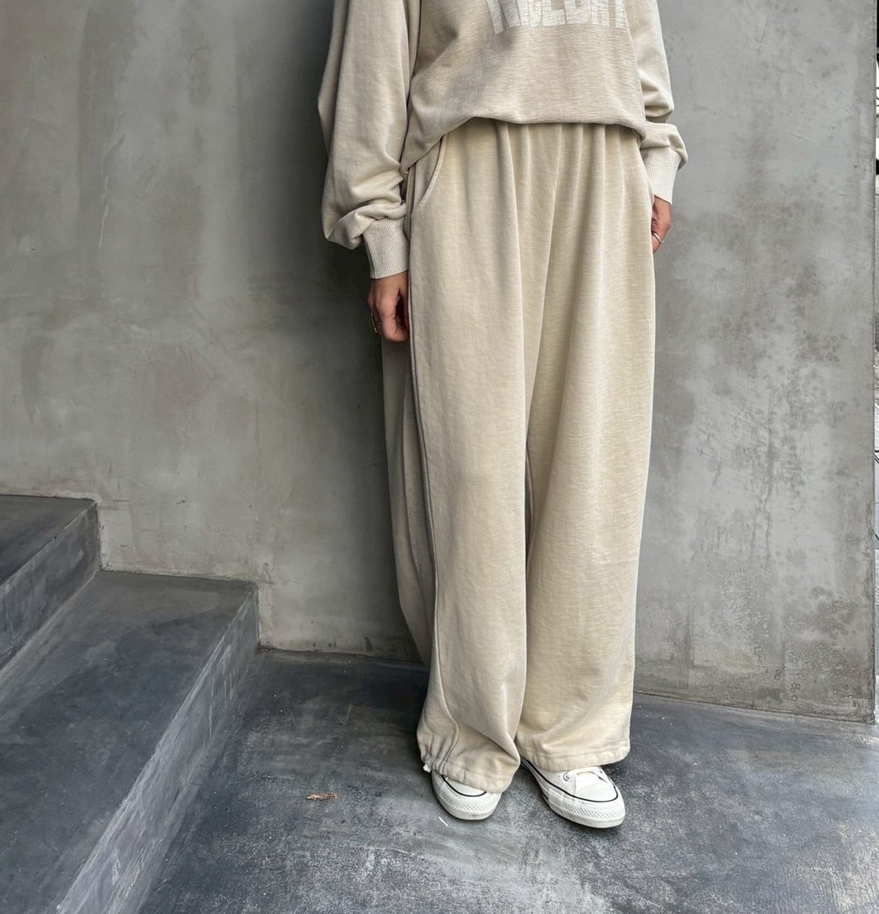 スラブ生地の裏表を使いサイドにタックデザイン(タック部分がスラブ生地)で動きのあるデザインに仕上げました。ウエストはゴム×コード仕様で裾にもコードが入っていますので絞っても履いていただけます。同素材のスラブロゴロンTとセットアップで着ていただけます。カラーはオフ、サンド、チャコールの3色になります。