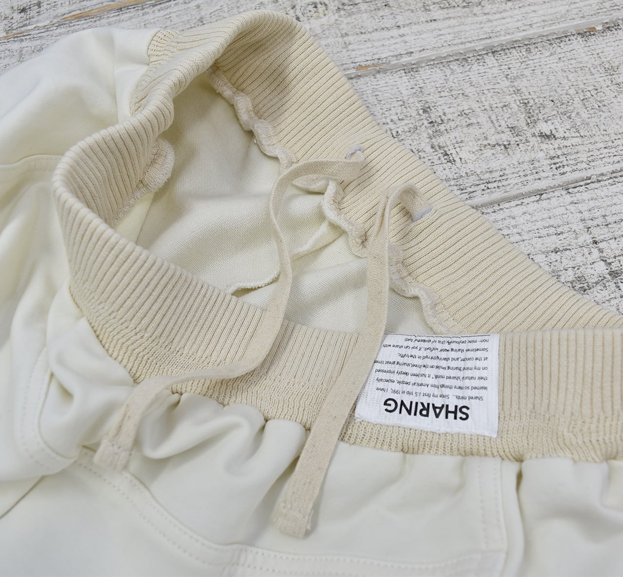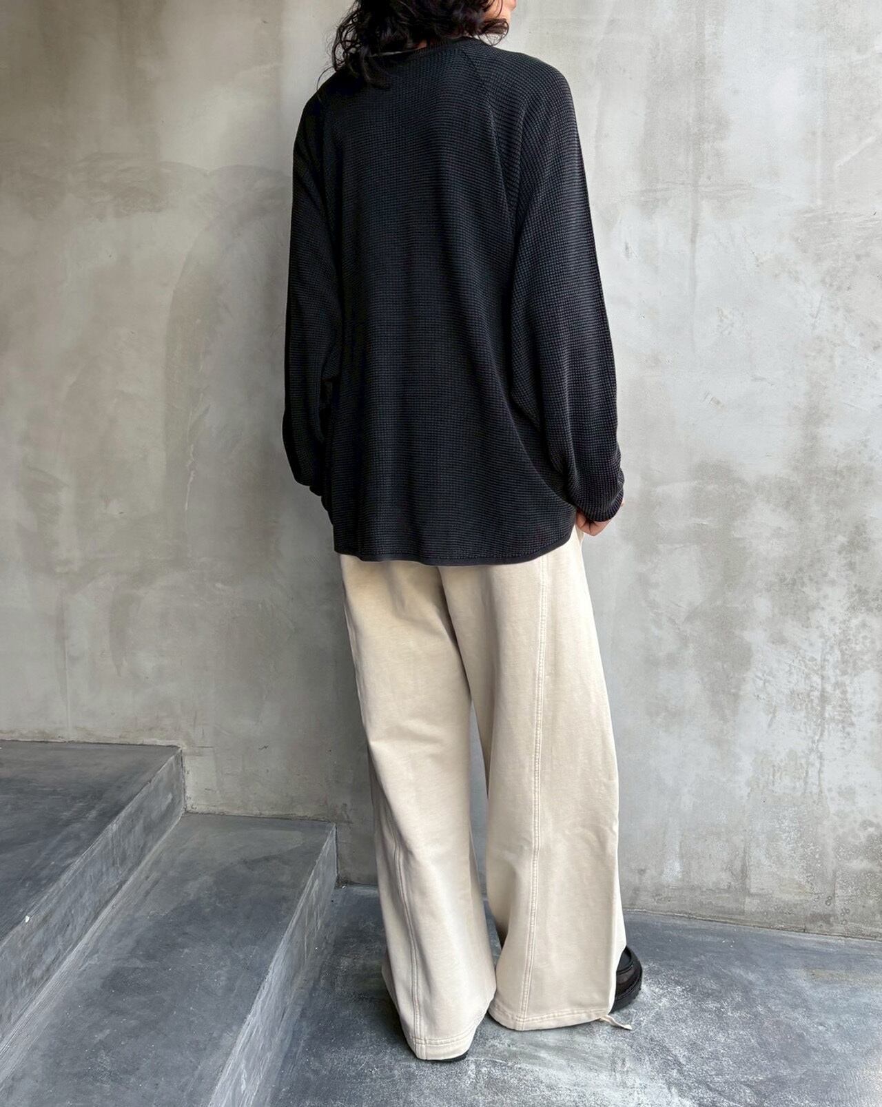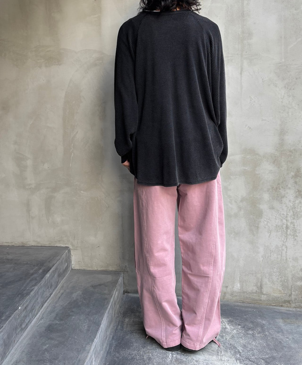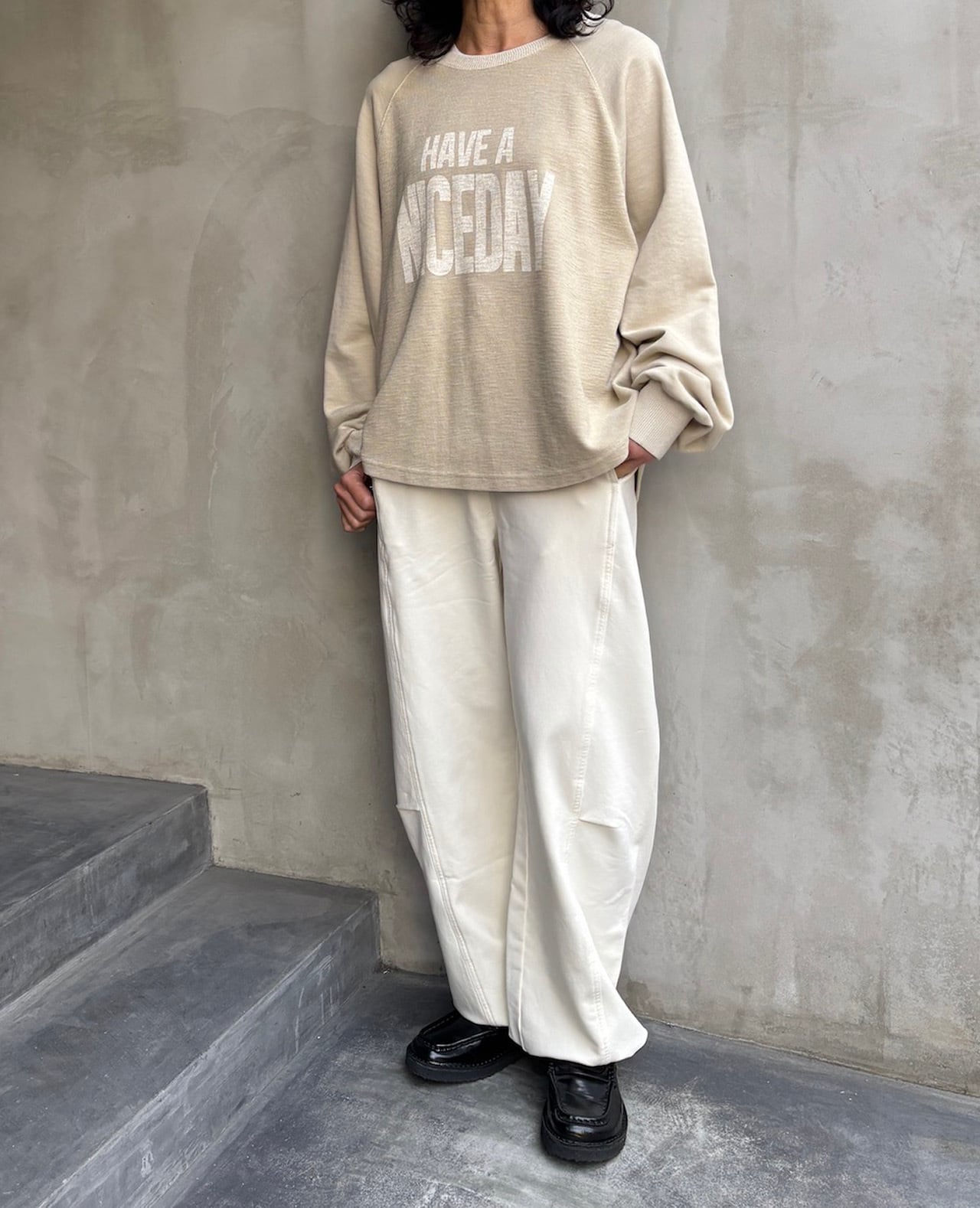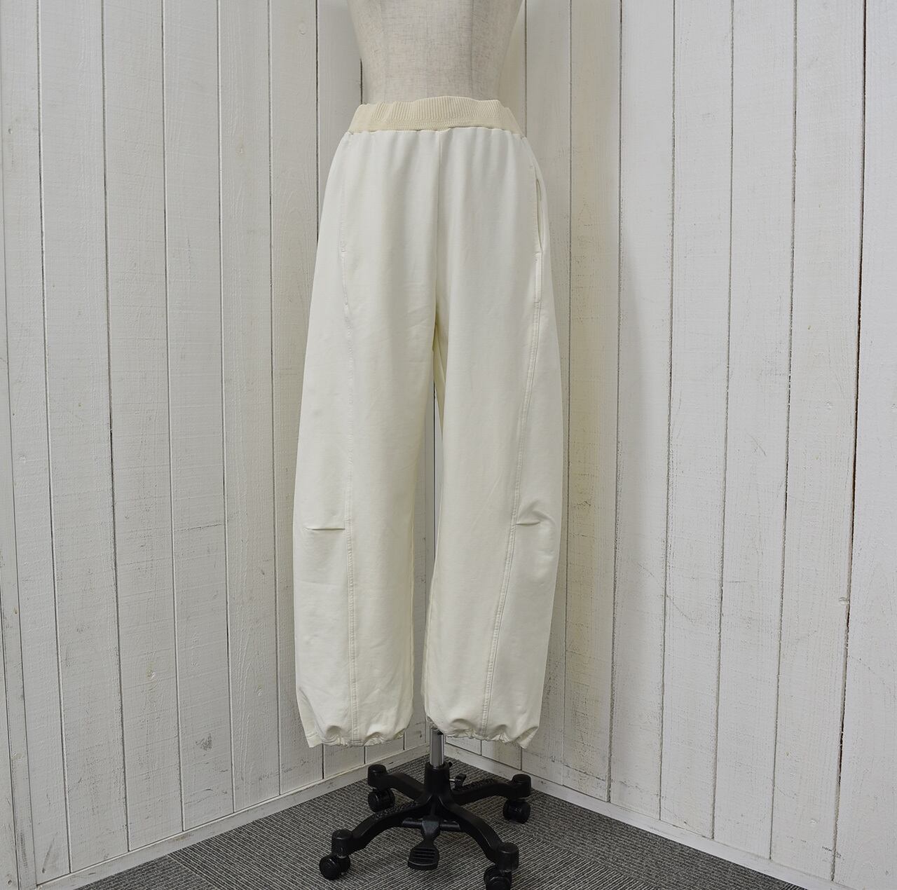 緩やかなカーブの裏毛バレルパンツ。幅広いコーディネートを楽しんでいただく為にあまりカーブを強調せずにセンターにラインを入れる事で足を綺麗に見せるデザインしています。柔らかい伸縮性に優れた素材(ストレッチ裏毛)で肌当たりが良く季節問わずに着用していただけます。裾には調節可能な紐が付いており、お好みのスタイルにアレンジが可能です。カラーはオフ、サンドベージュ、スモーキーピンク、チャコールの4色になります。