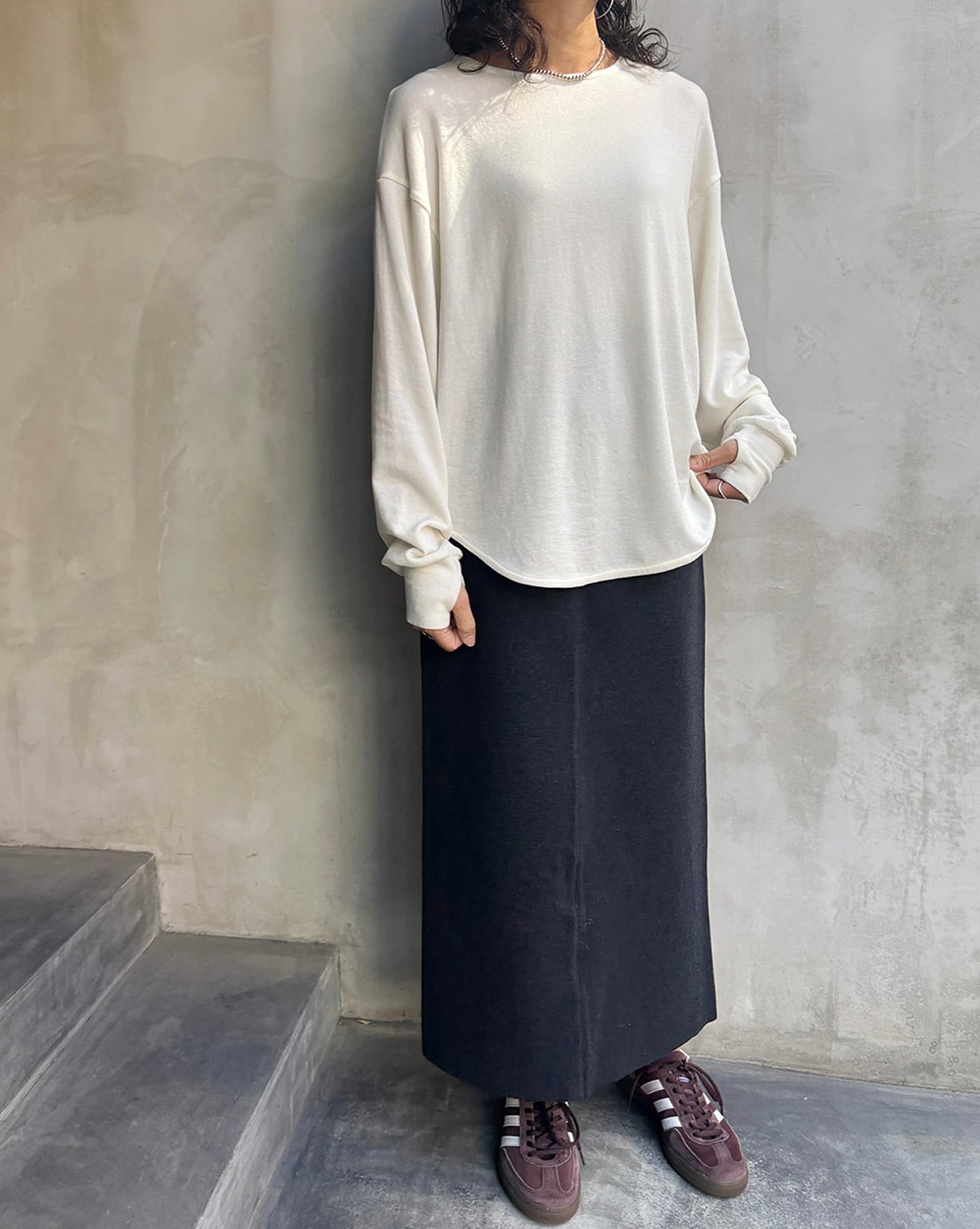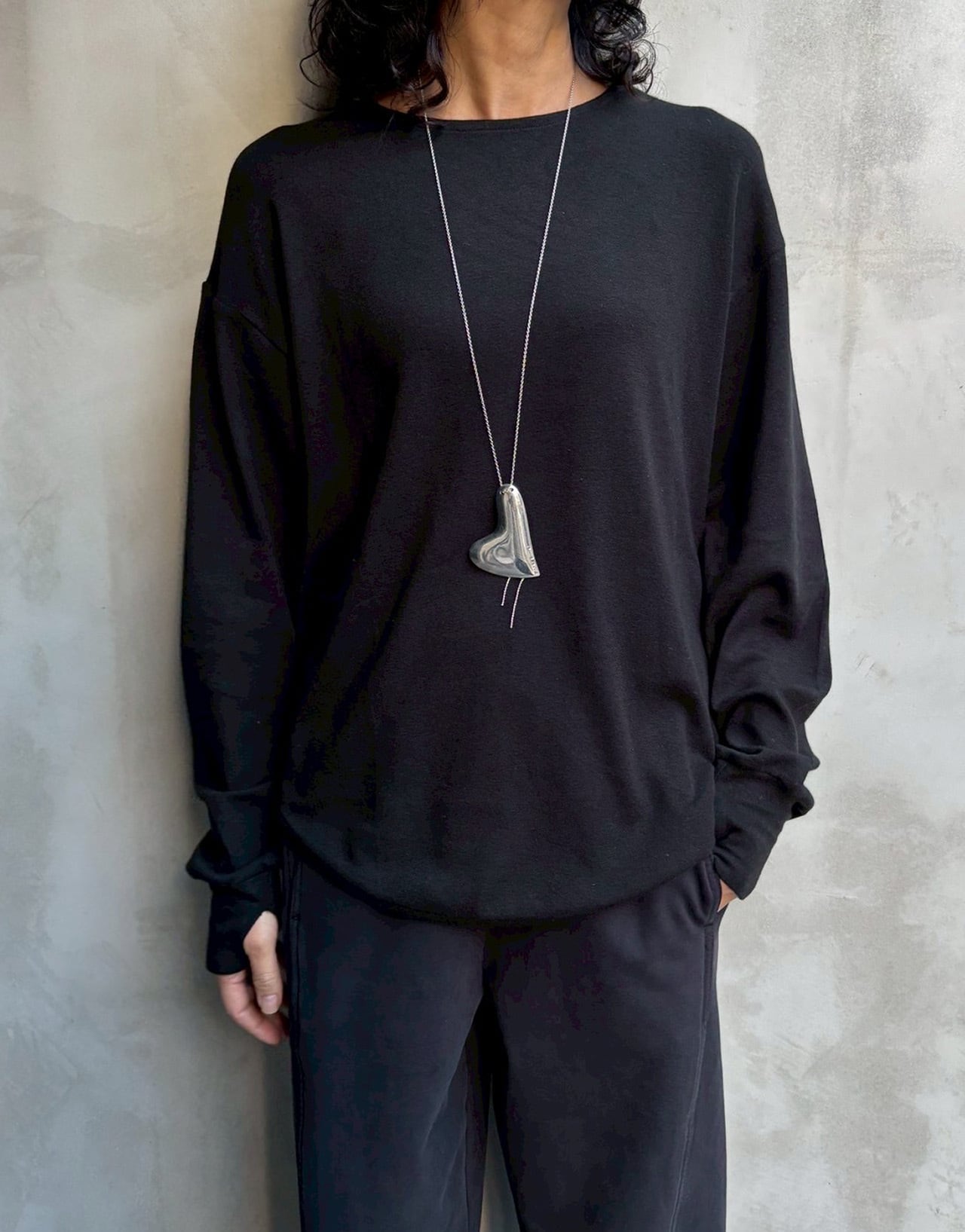 ウール混で暖かく、しなやかで肌触りの良い素材のロングスリーブT。ゆとりのあるサイズ感ですが落ち感がある為インナーに着ていただいても中でもたつきにくいのでおすすめです。袖先は手の甲まで暖かい指ぬき仕様になっています。カラー違いで購入される方が多く人気のロンTになります。カラーはオフ、ブラックの2色になります。