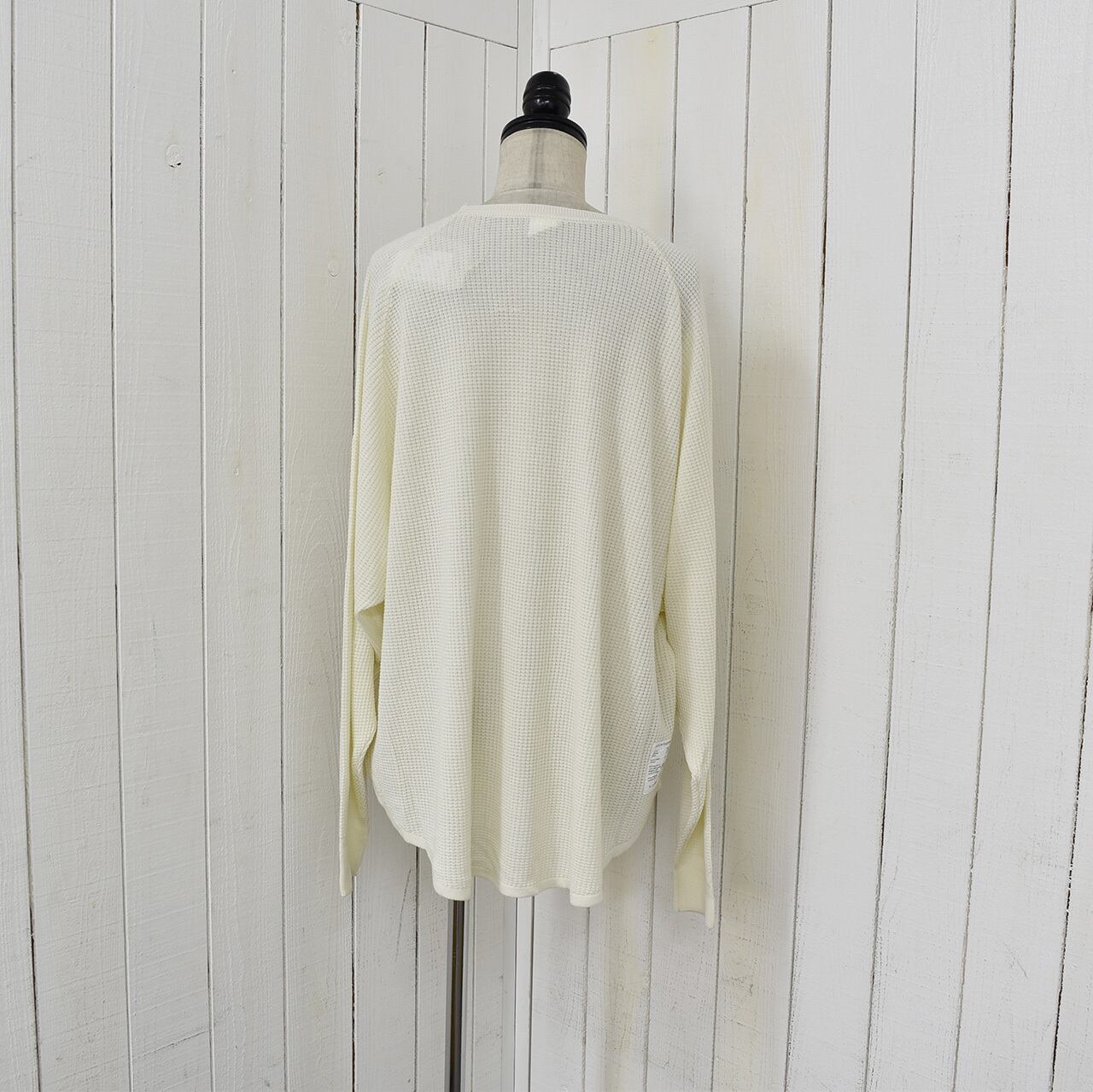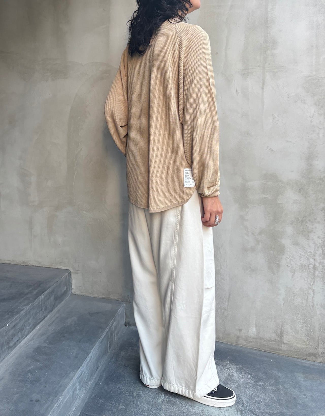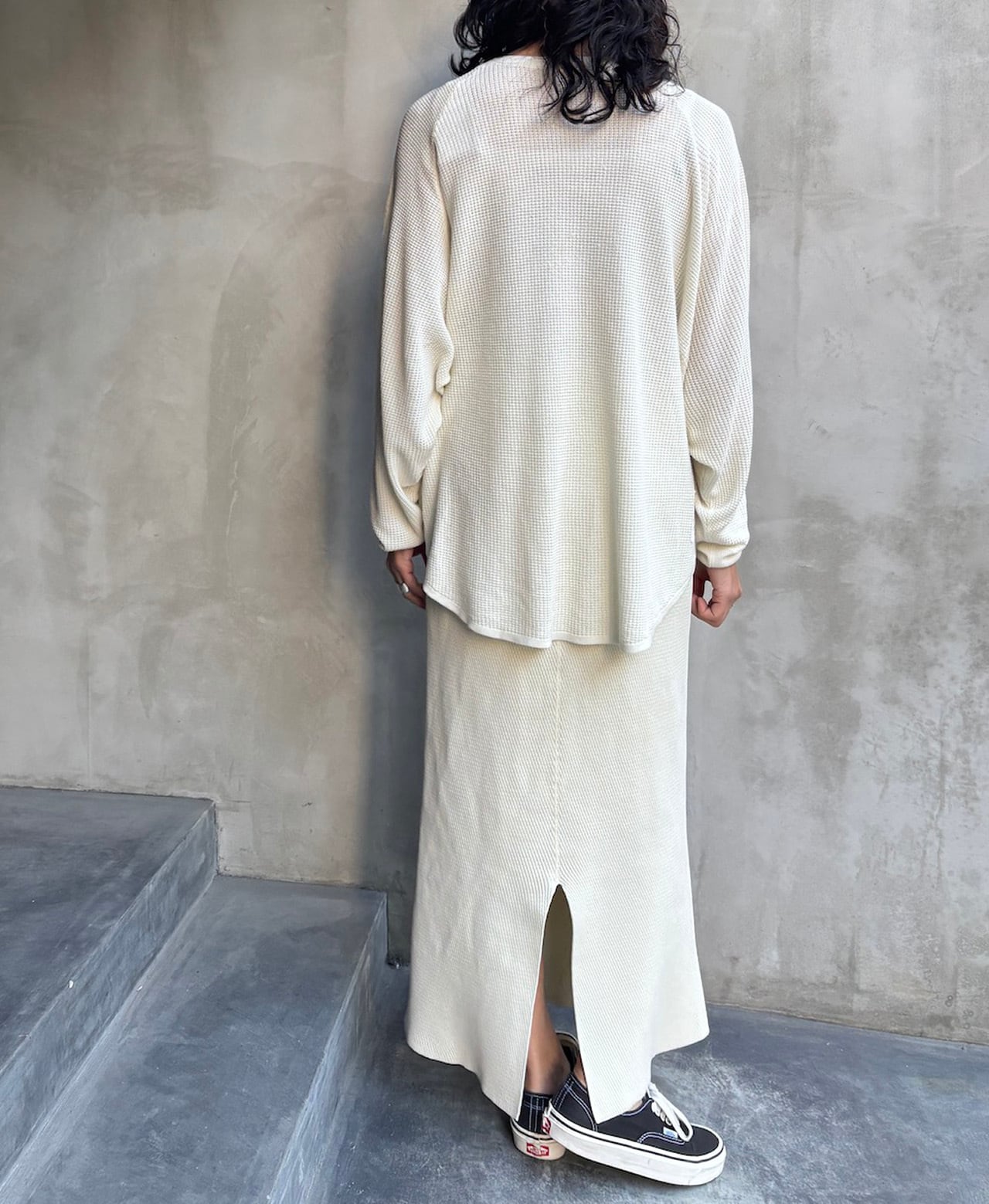 テンセル糸をワッフル編みで仕上げたロンTです。しなやかな素材で落ち感が出て女性らしい印象を与えてくれます。同じカラーで展開しているハニカムワッフル編みタイトスカート(素材違い)とのセットアップもおすすめです。