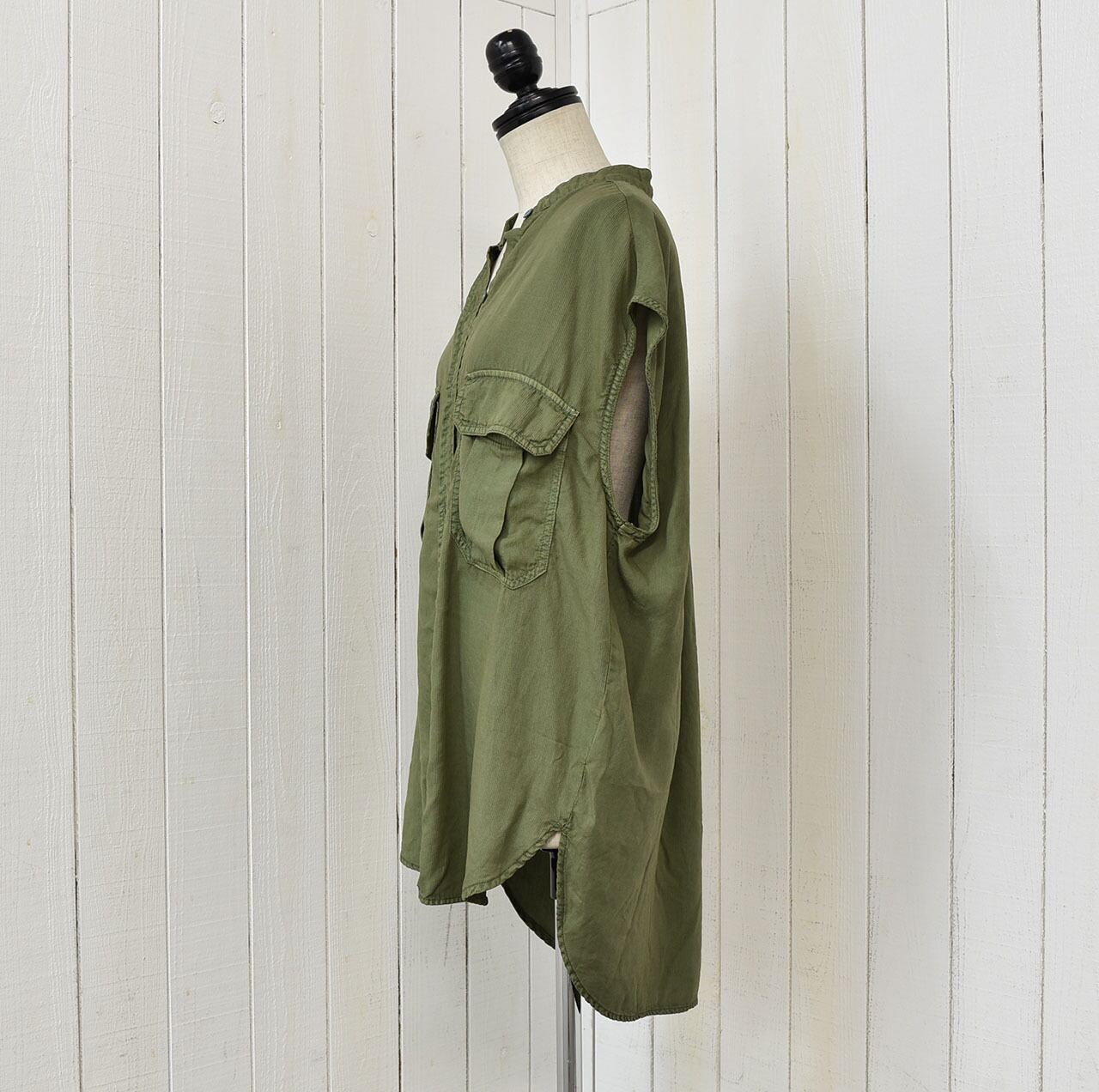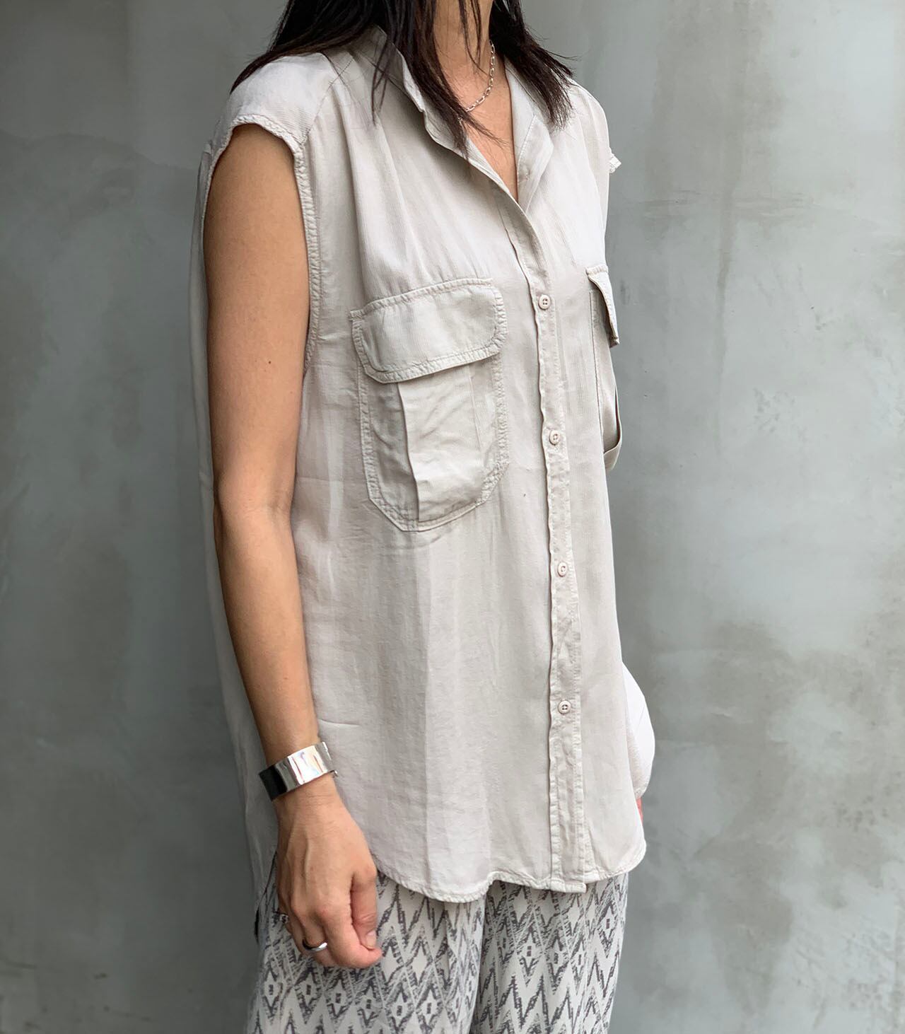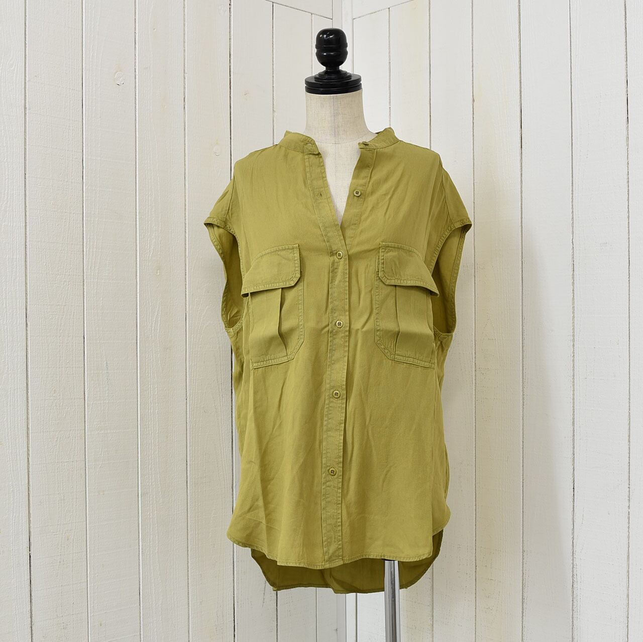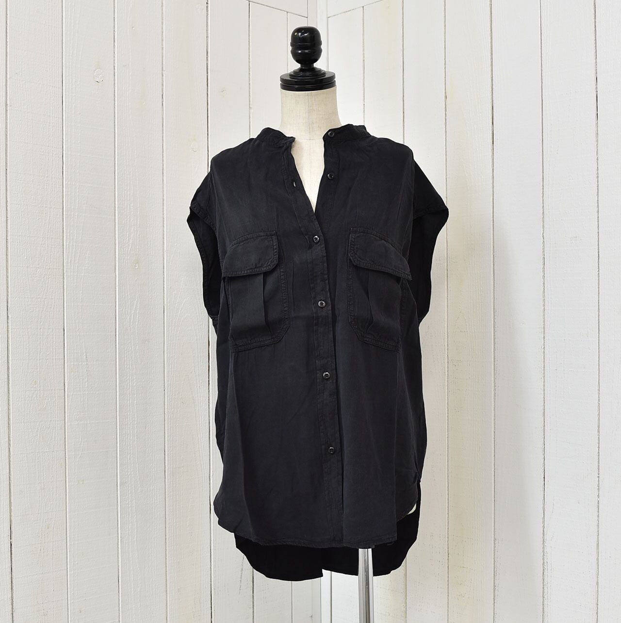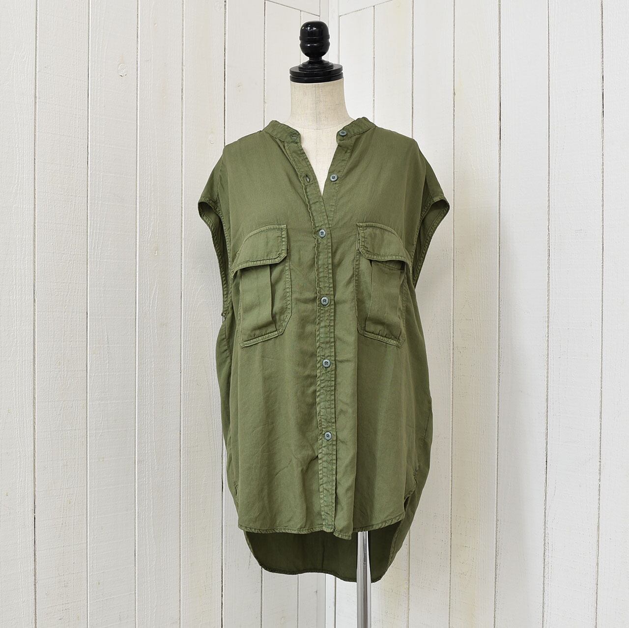 しなやかな素材のテンセルのノースリーブブラウス。大きめのフラップポケットでワークウエアーテイストを取り入れカッコ良くも綺麗めスタイルにも!同素材のパンツとスカートでセットアップとしてもお楽しみ頂けます。
