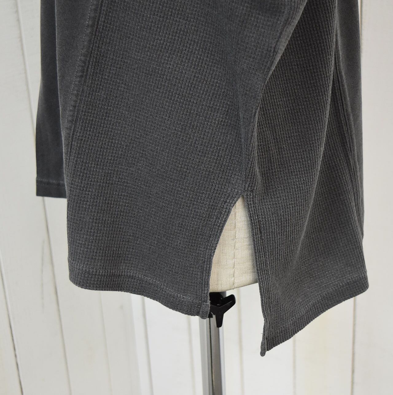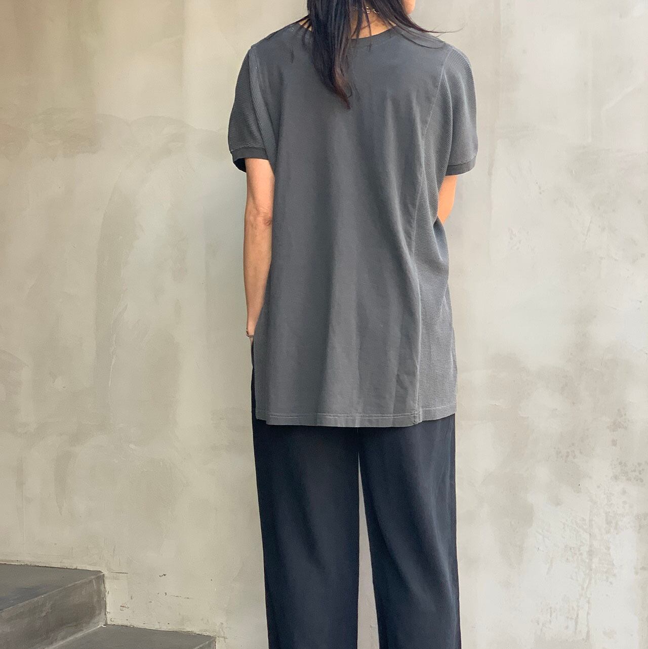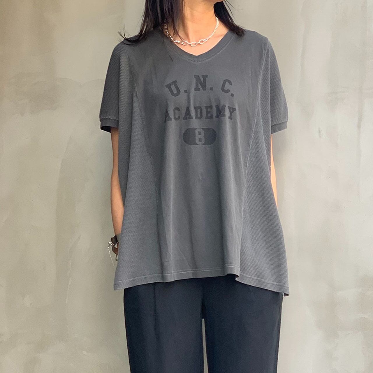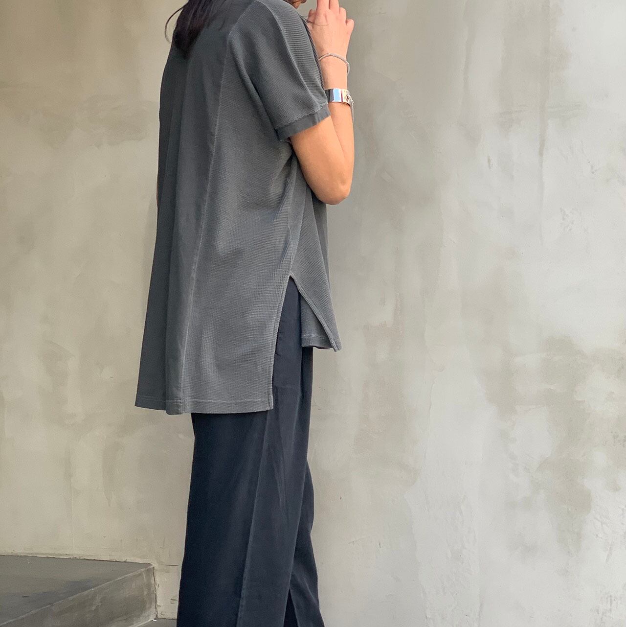 両サイドにワッフル素材の切替をデザインしたポンチョ型のVネックTシャツ。身体に添わずに夏でも涼しく着て頂けます。同色のプリントなので主張し過ぎないのも◎。