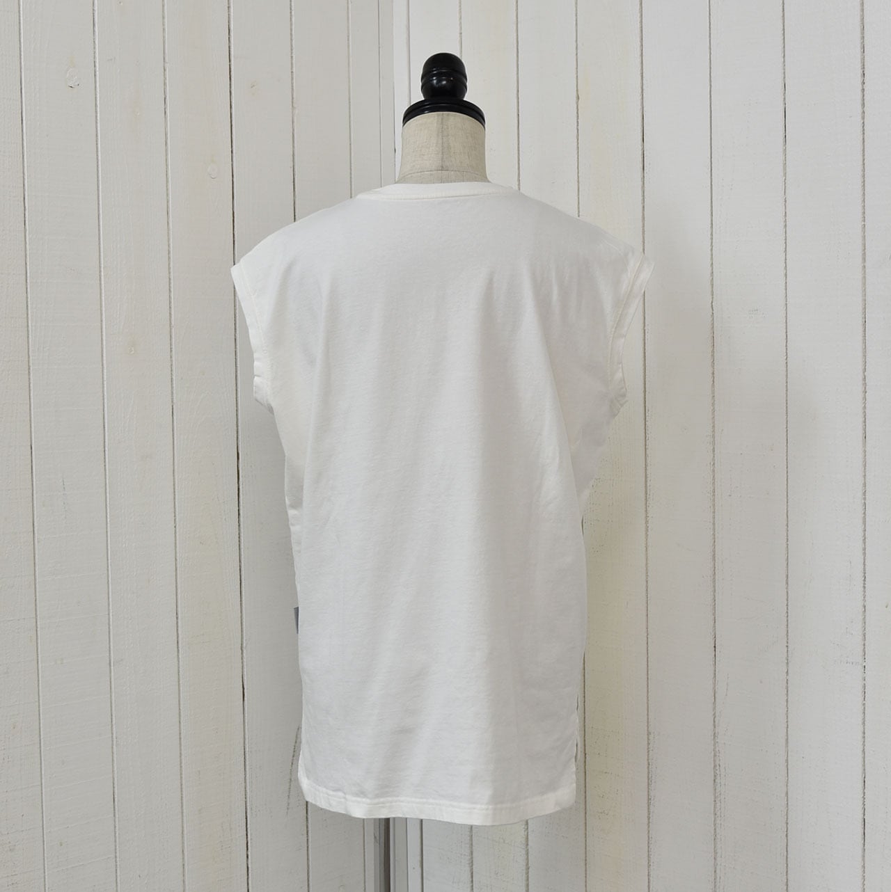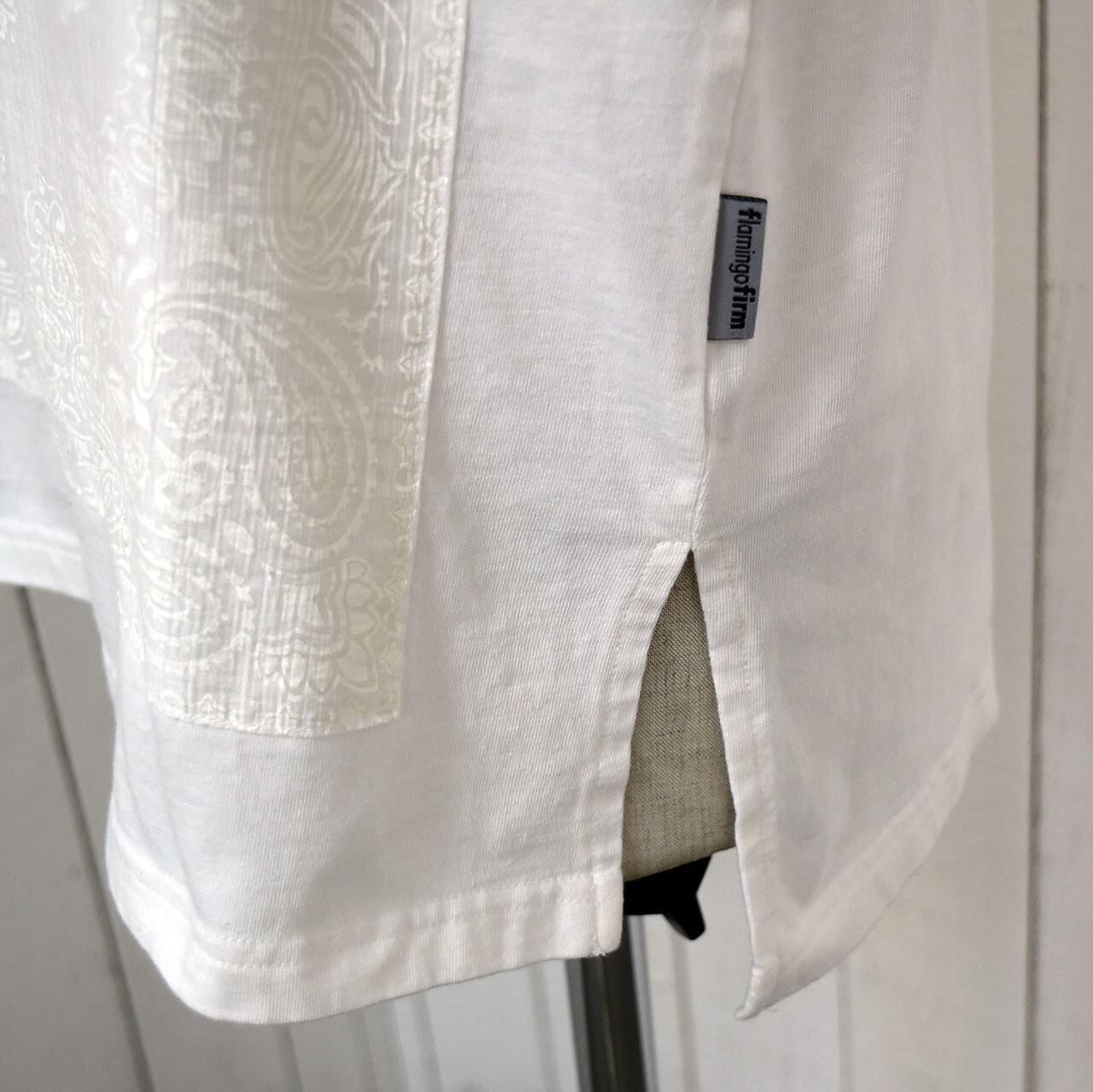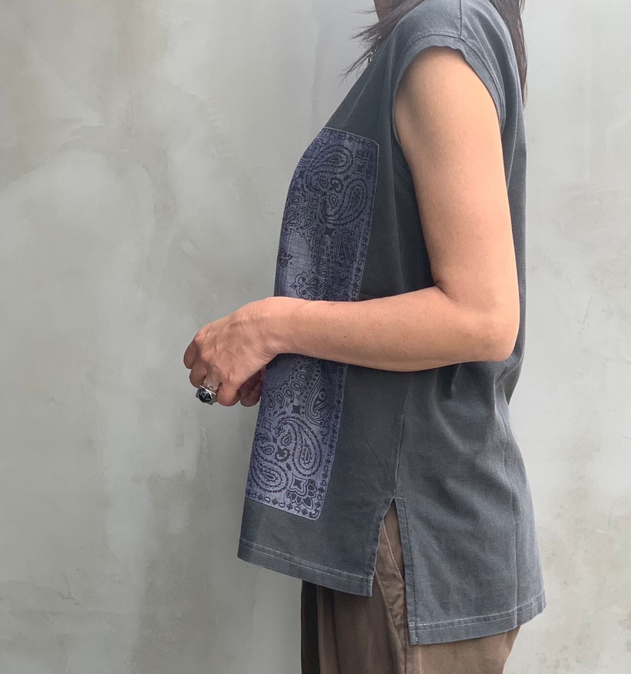 透け感のある生地にバンダナ柄をプリントし貼り付けたノースリーブシャツ。少し肩から落ちる袖が腕を強調せずカバーしてくれます。プリントも主張し過ぎない柄なので大人の女性にもおすすめです。
