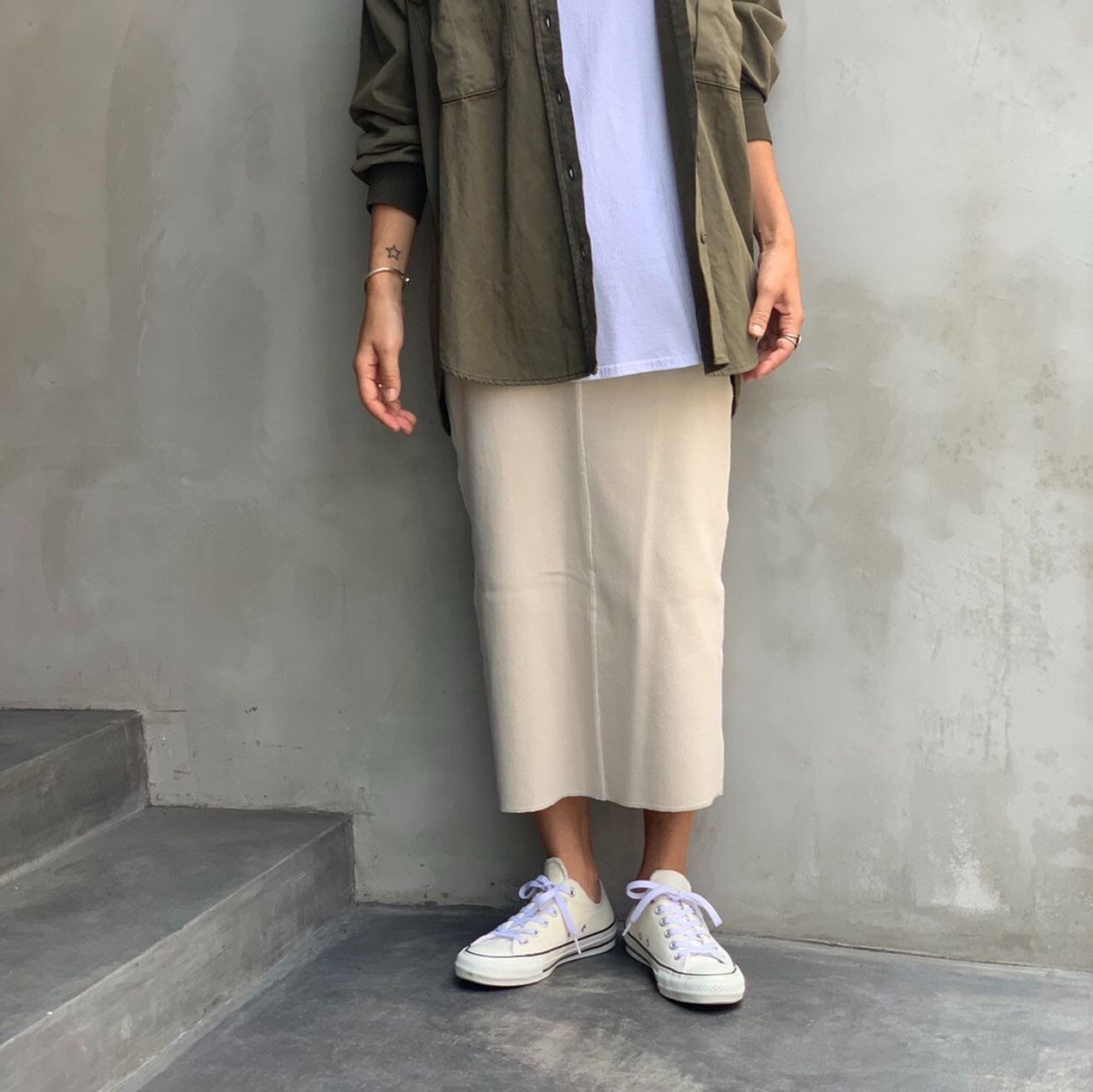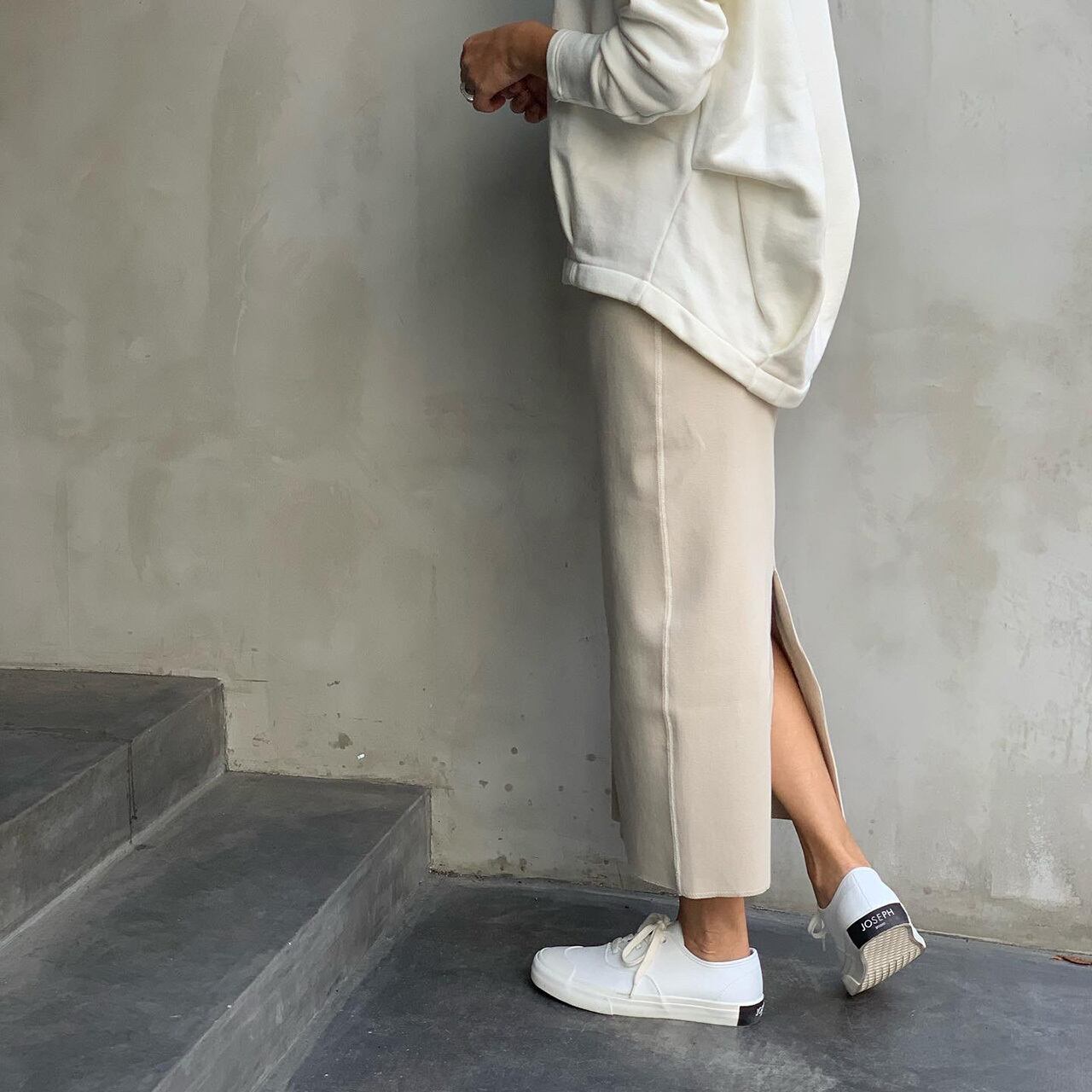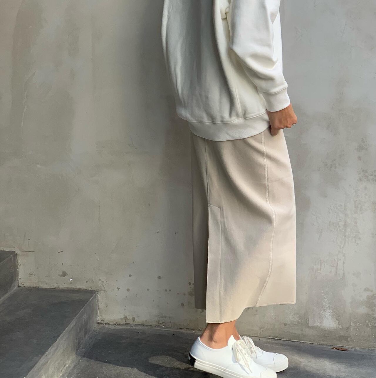しっかりしたリブ素材のタイトスカートです。フィット感はありながらもひびきにくいのが特徴です。スッキリしたシルエットで細見え効果も◎。オーバーサイズのトップスとも相性が良く、万能に使えるスカートです。