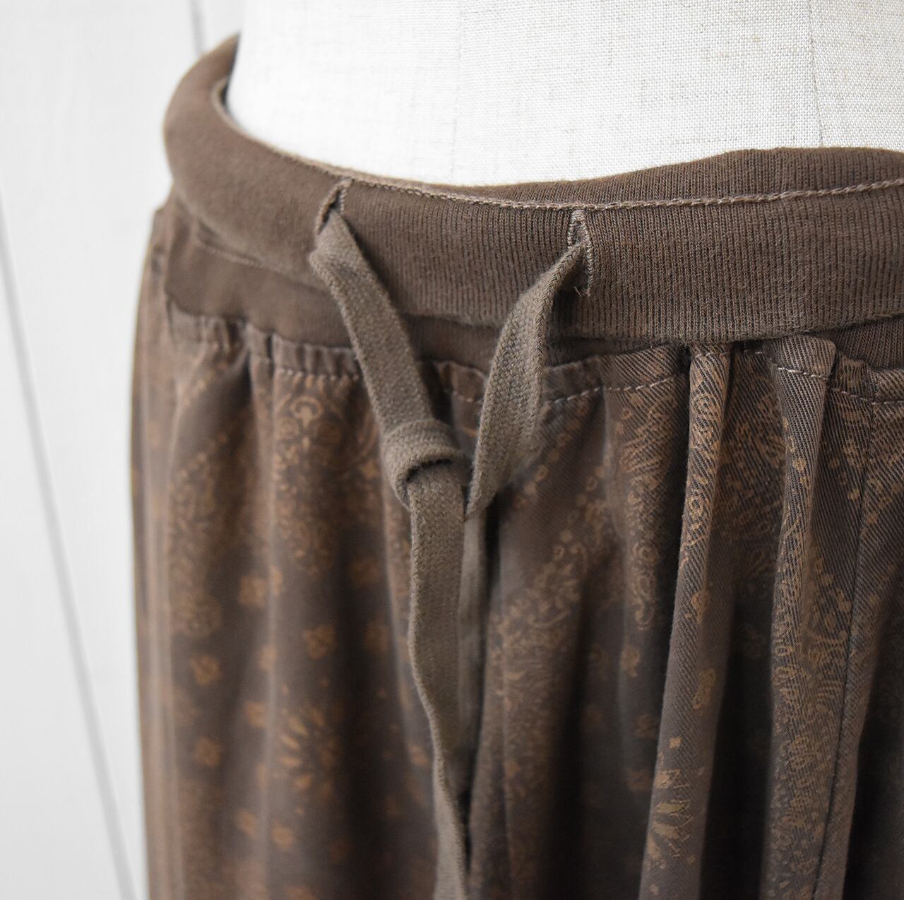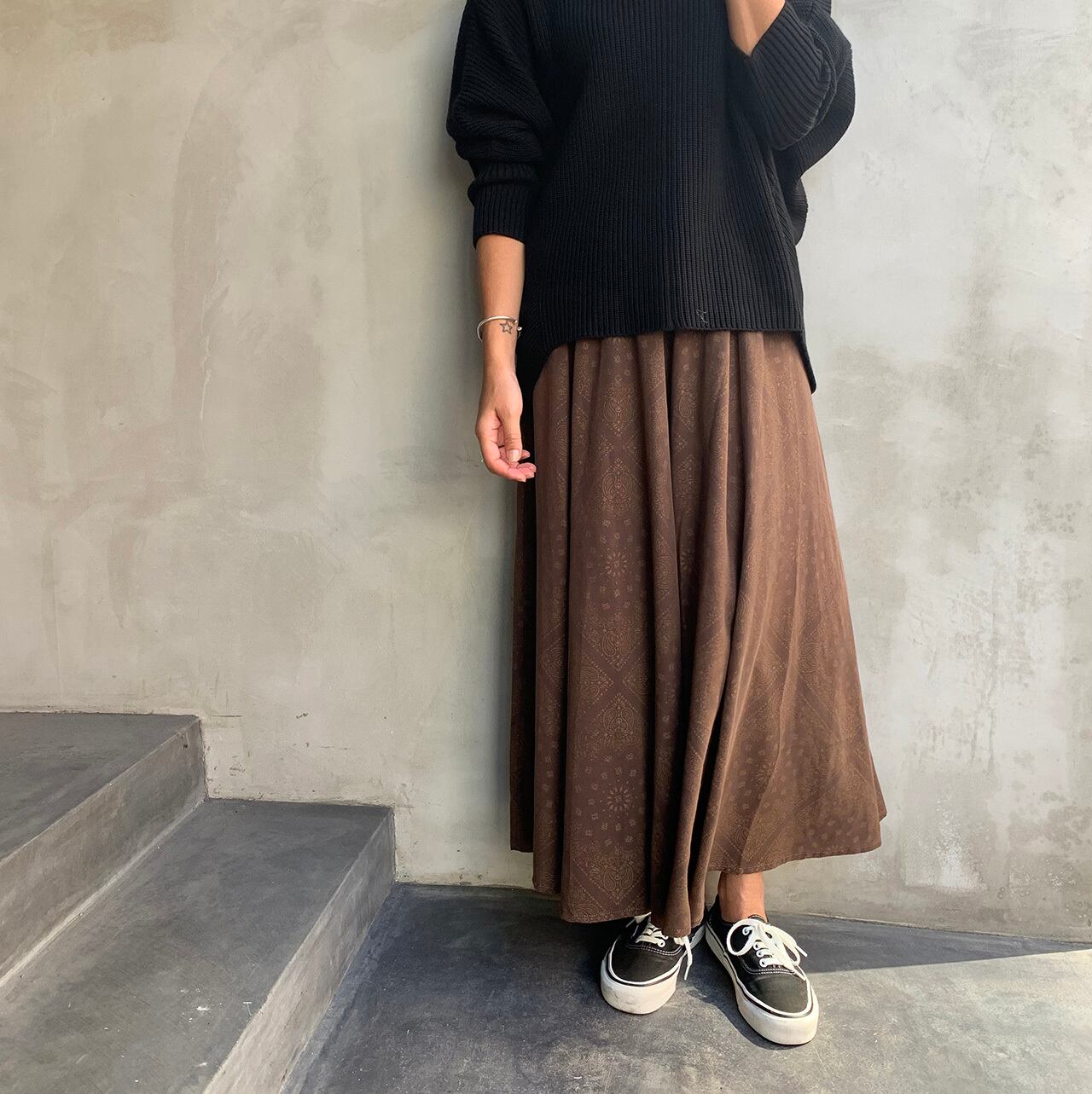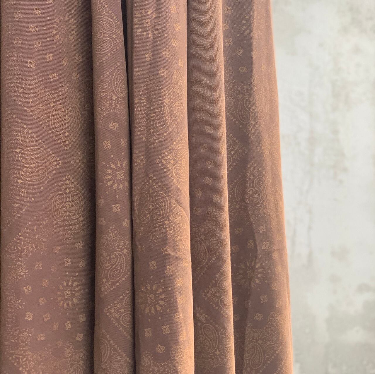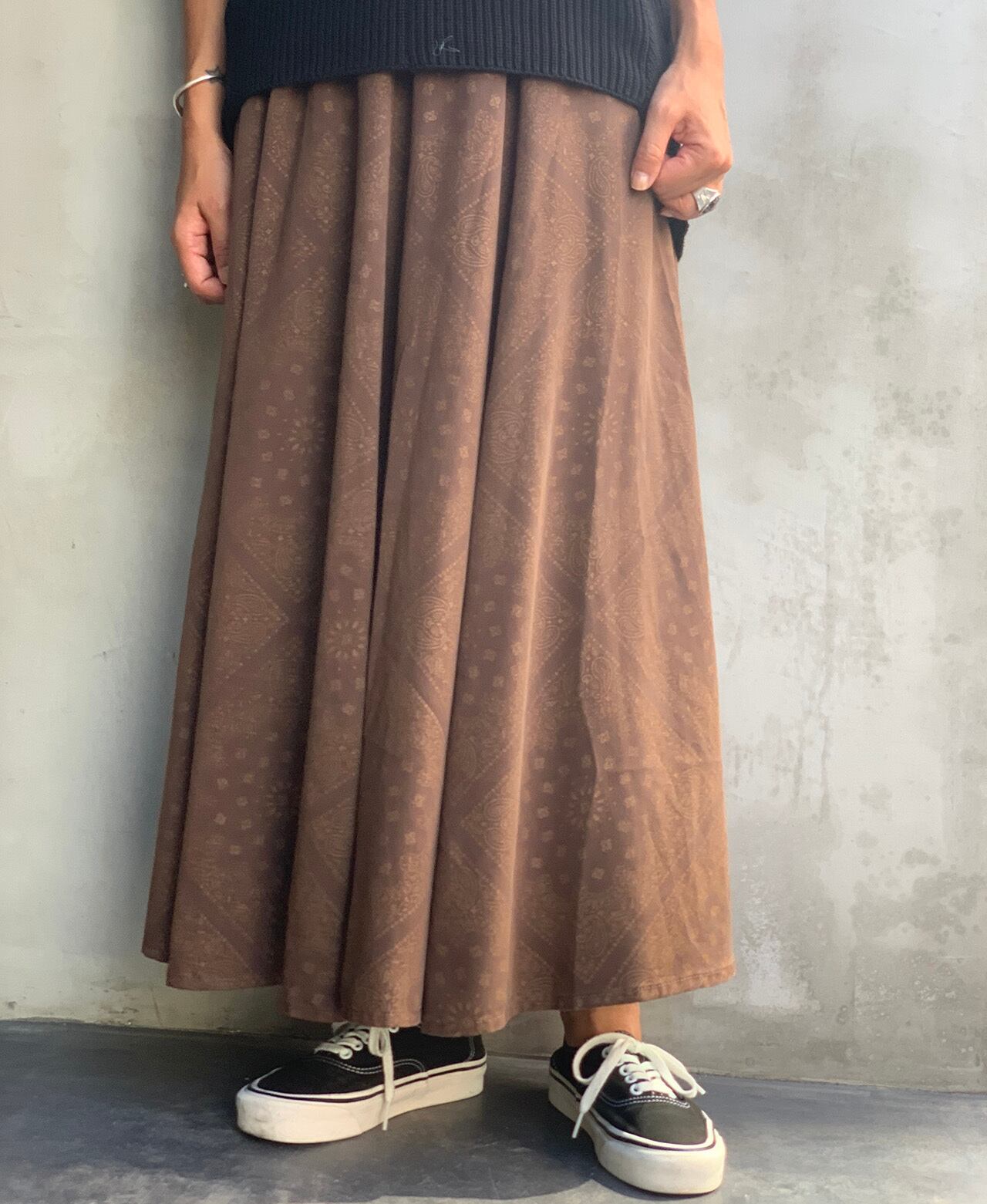 テンセル素材にバンダナ柄をプリントしたロングスカート。同系色のプリントですのでさり気なく効いているところが◎。ウエストはゴム仕様で裏には紐も付いていますので調節可能です。ロングシーズン履いていただけます。