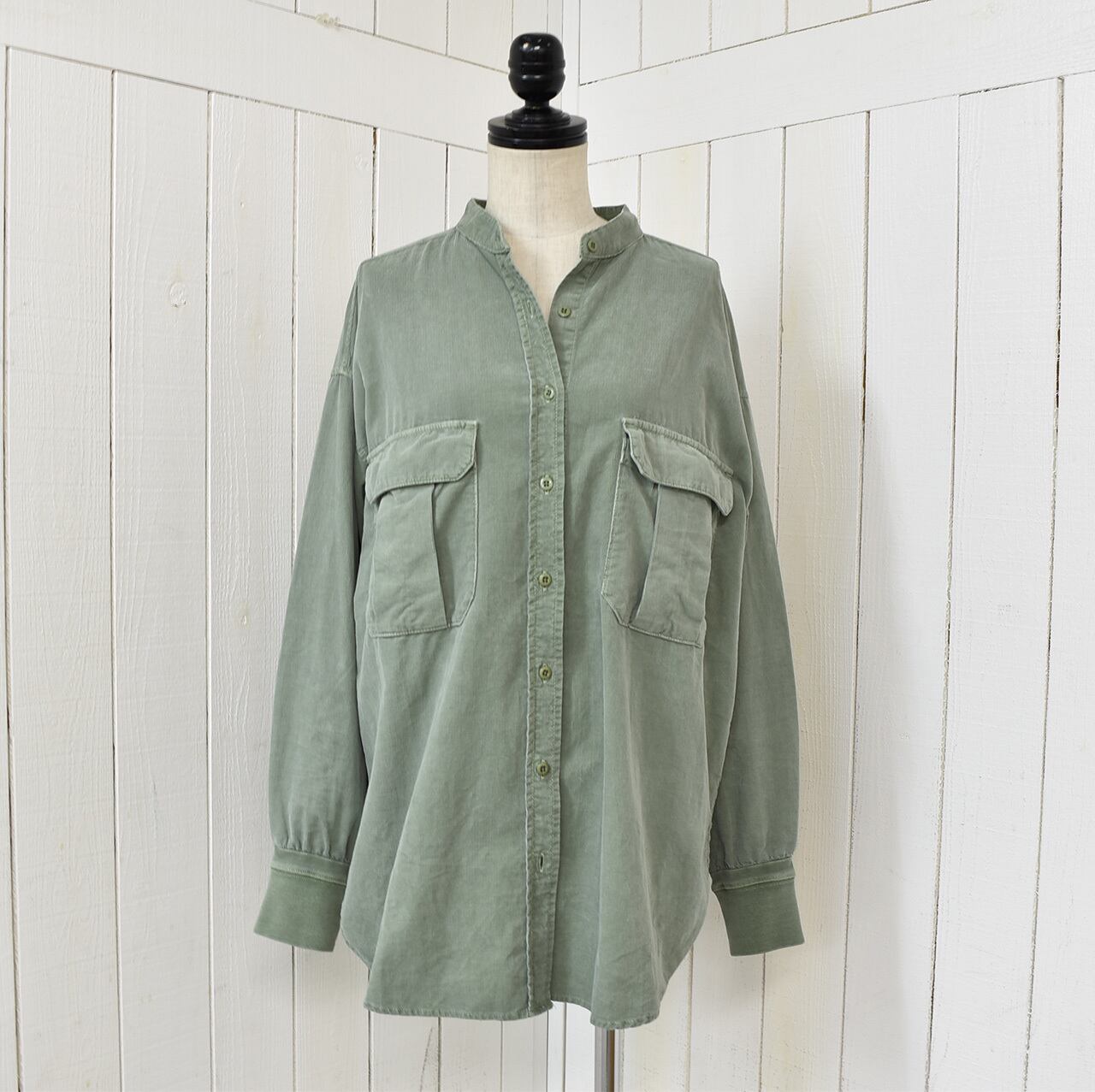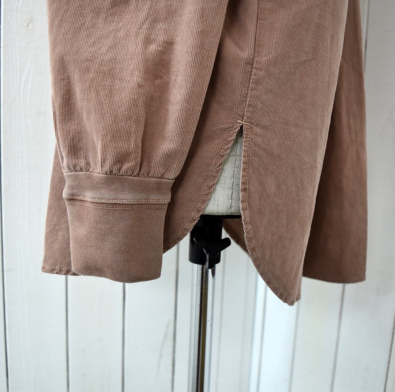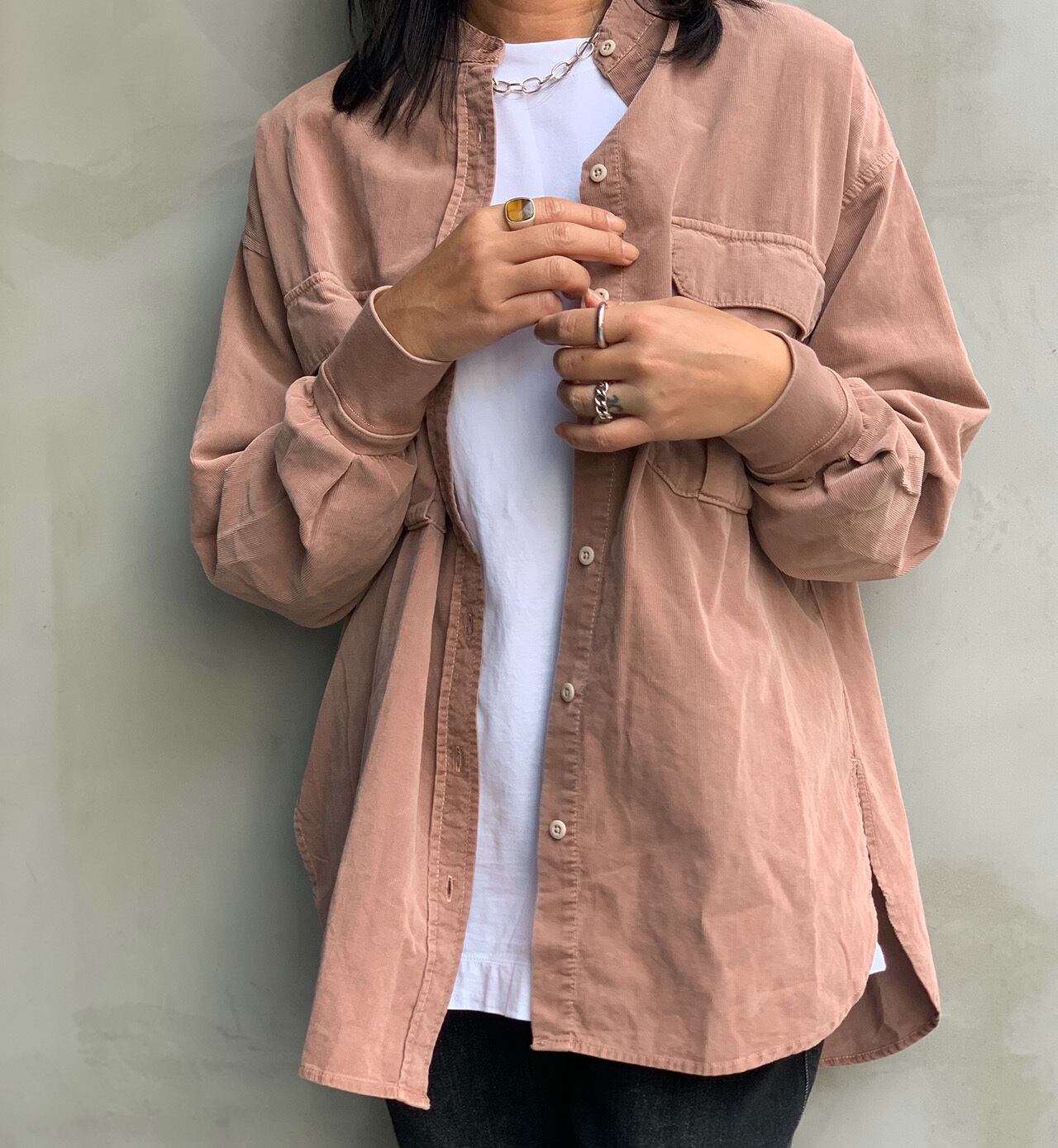 細コーデュロイの袖口がリブになったバンドカラーシャツ。袖口がリブになっていますので自然に形が決まるのが◎。シャツとしてはもちろん、季節の変わり目の羽織りにも!