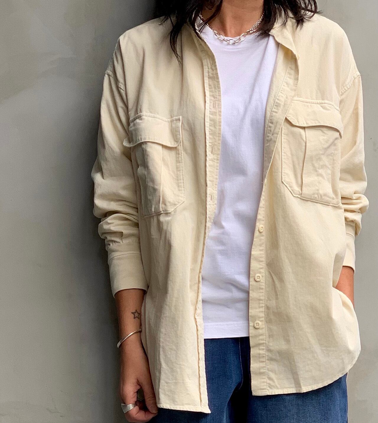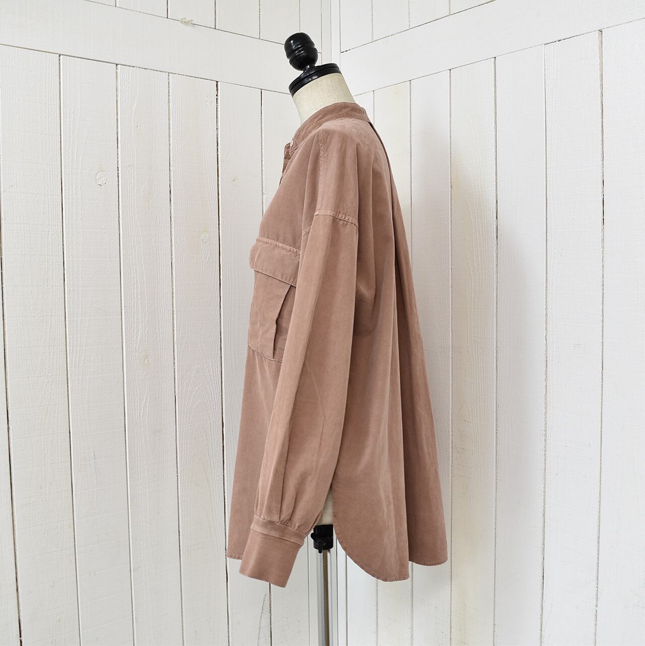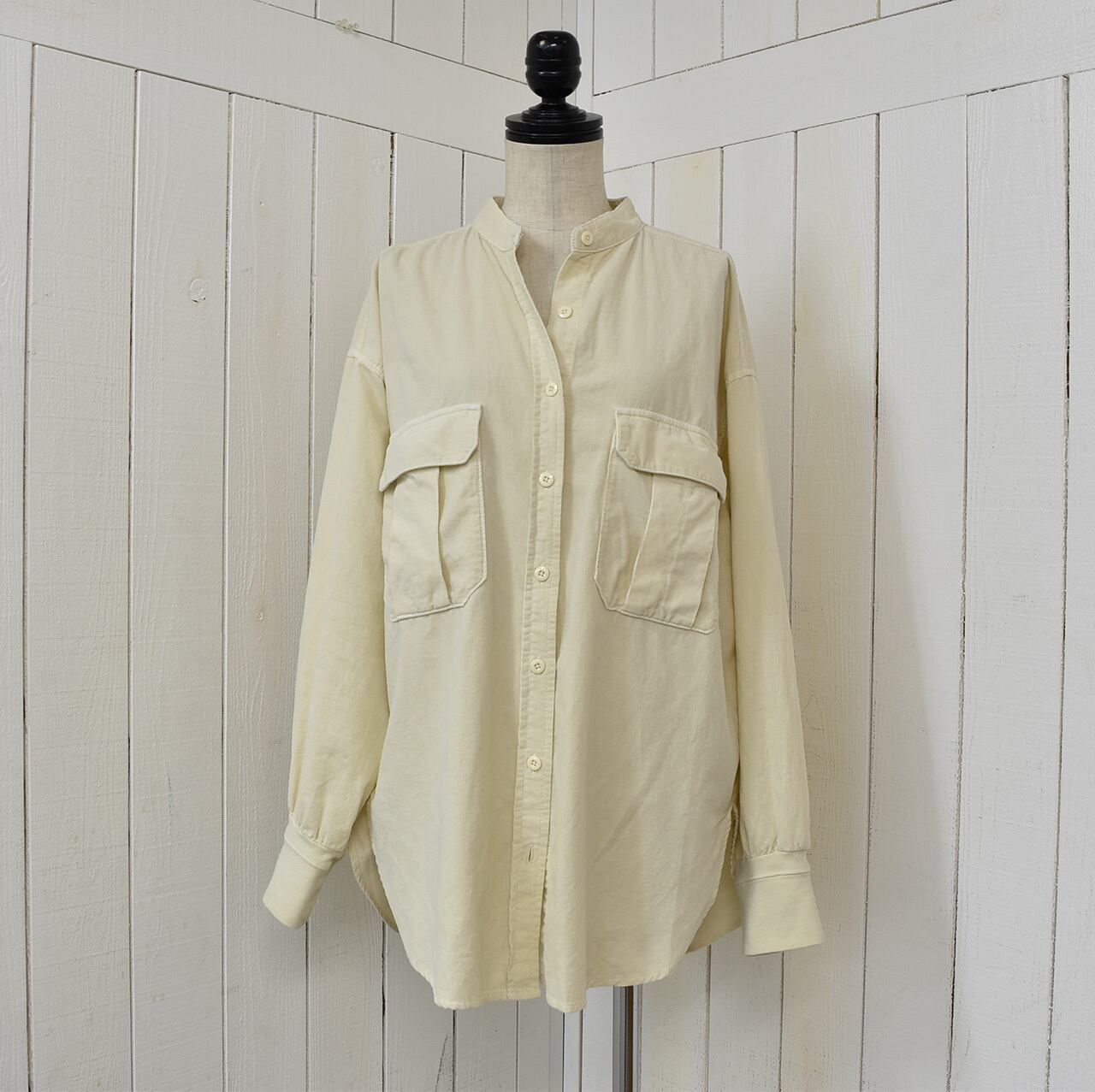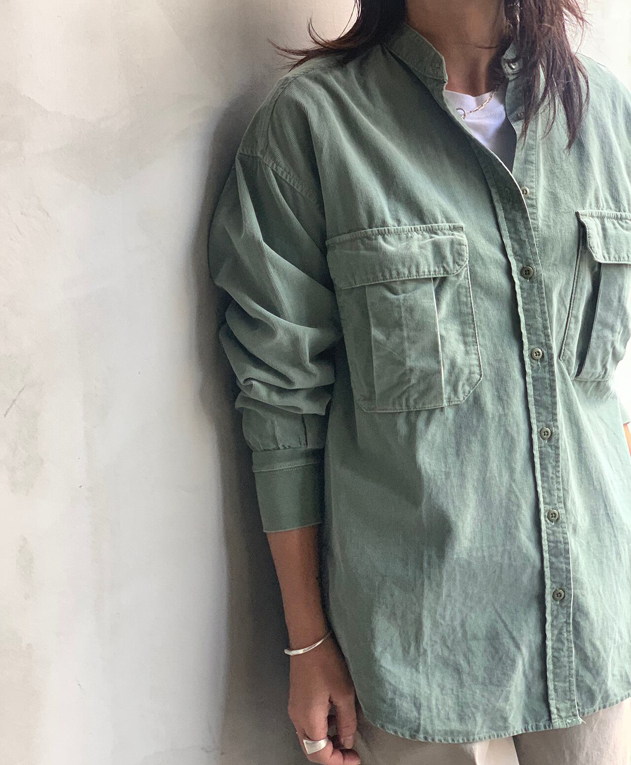 細コーデュロイの袖口がリブになったバンドカラーシャツ。袖口がリブになっていますので自然に形が決まるのが◎。シャツとしてはもちろん、季節の変わり目の羽織りにも!