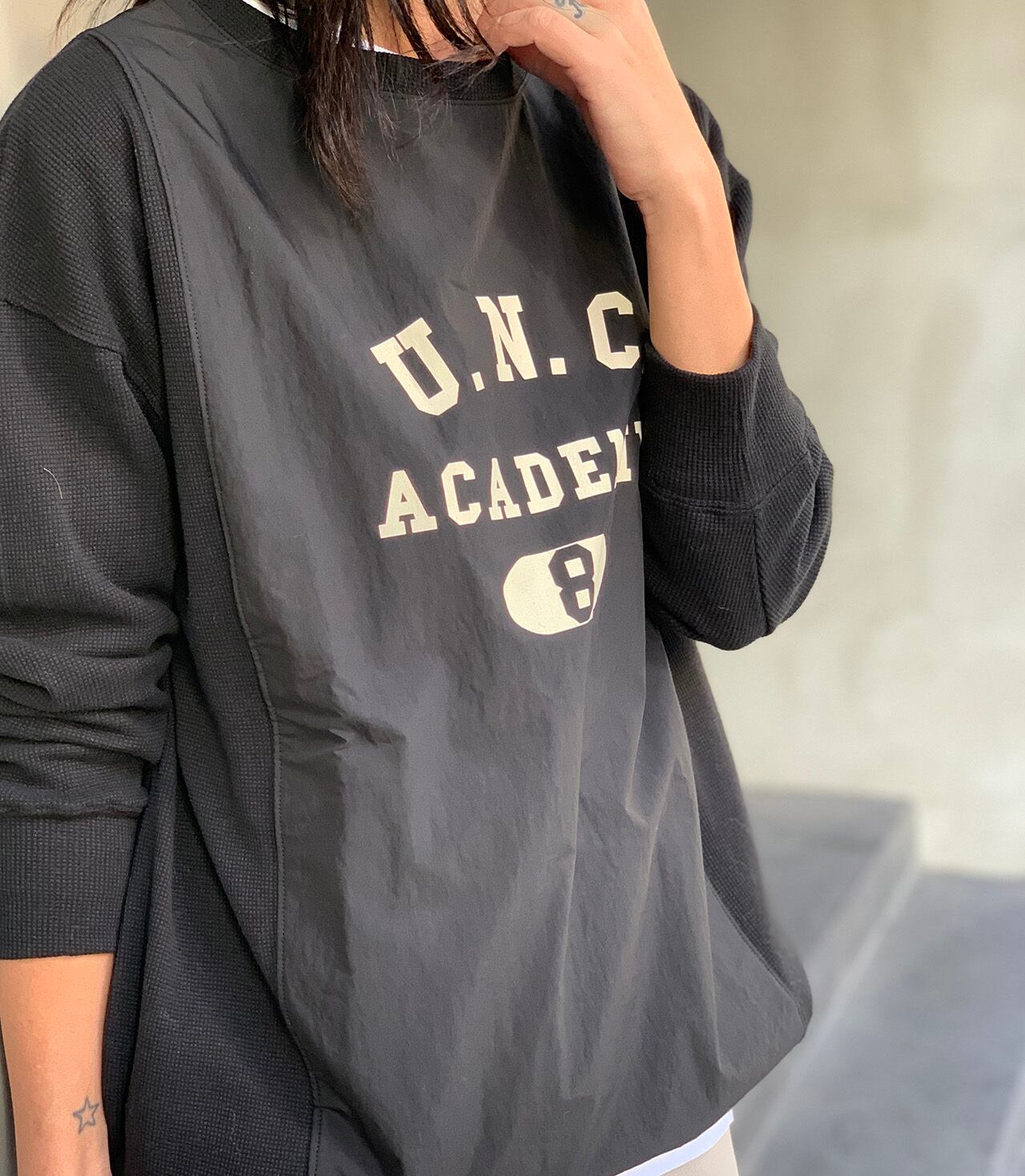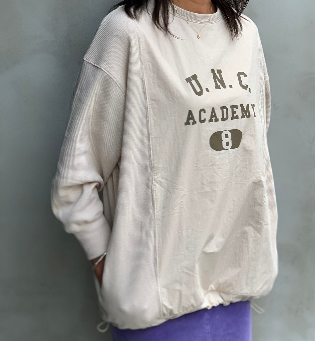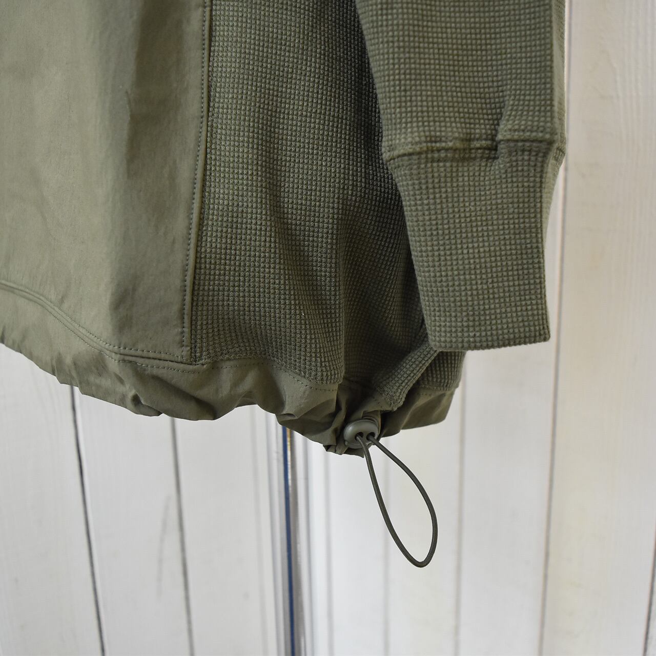 ワッフルとナイロンの異素材を合わせたロングスリーブTシャツ。ナイロン部分はワッフルとナイロンの2枚合わせになっています。中にインナーを合わせて冬も着て頂け、3シーズンお使い頂けます。裾はドロップコード仕様で一枚でも形が決まり易いデザインです。