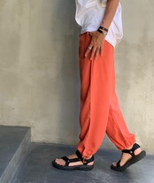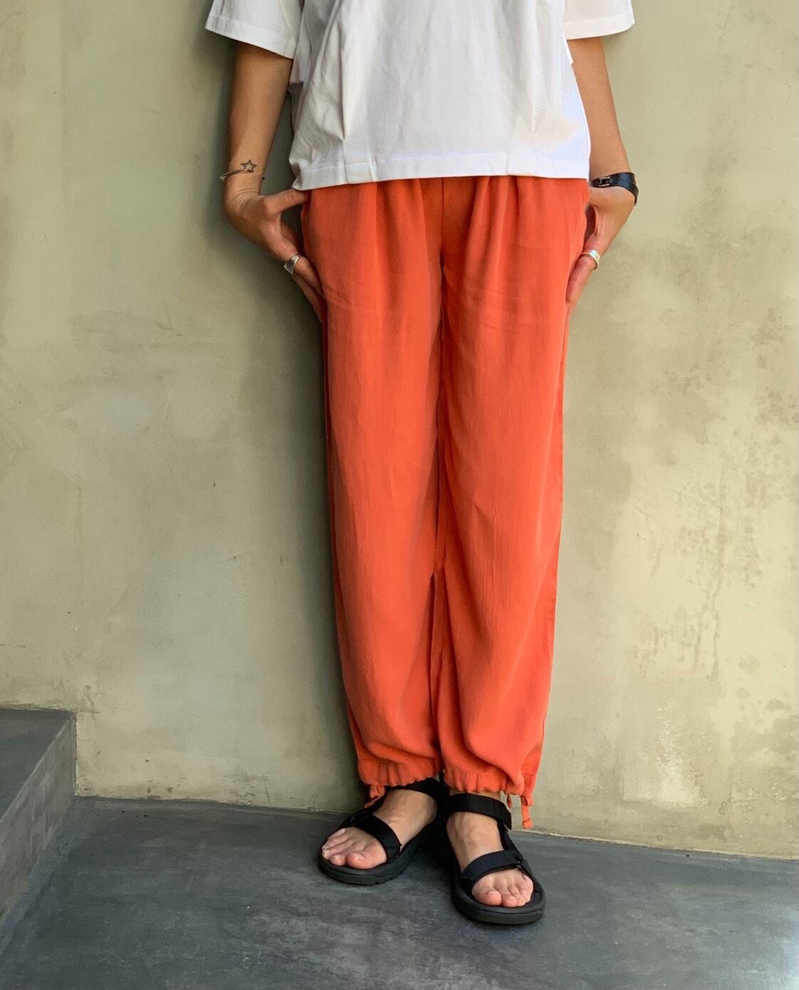 テンセルピケ の2wayで履ける裾絞りワイドパンツ 。ワイドパンツとして、裾を絞ってトレンドのバルーンパンツにしても履いていただけます。軽くて履き易く、ノーストレスで履いていただけます。カラーはベーシックなオフベージュ、ブラックとイエロー、オレンジ、ブルーグリーンのビビットなカラーの5色展開です。