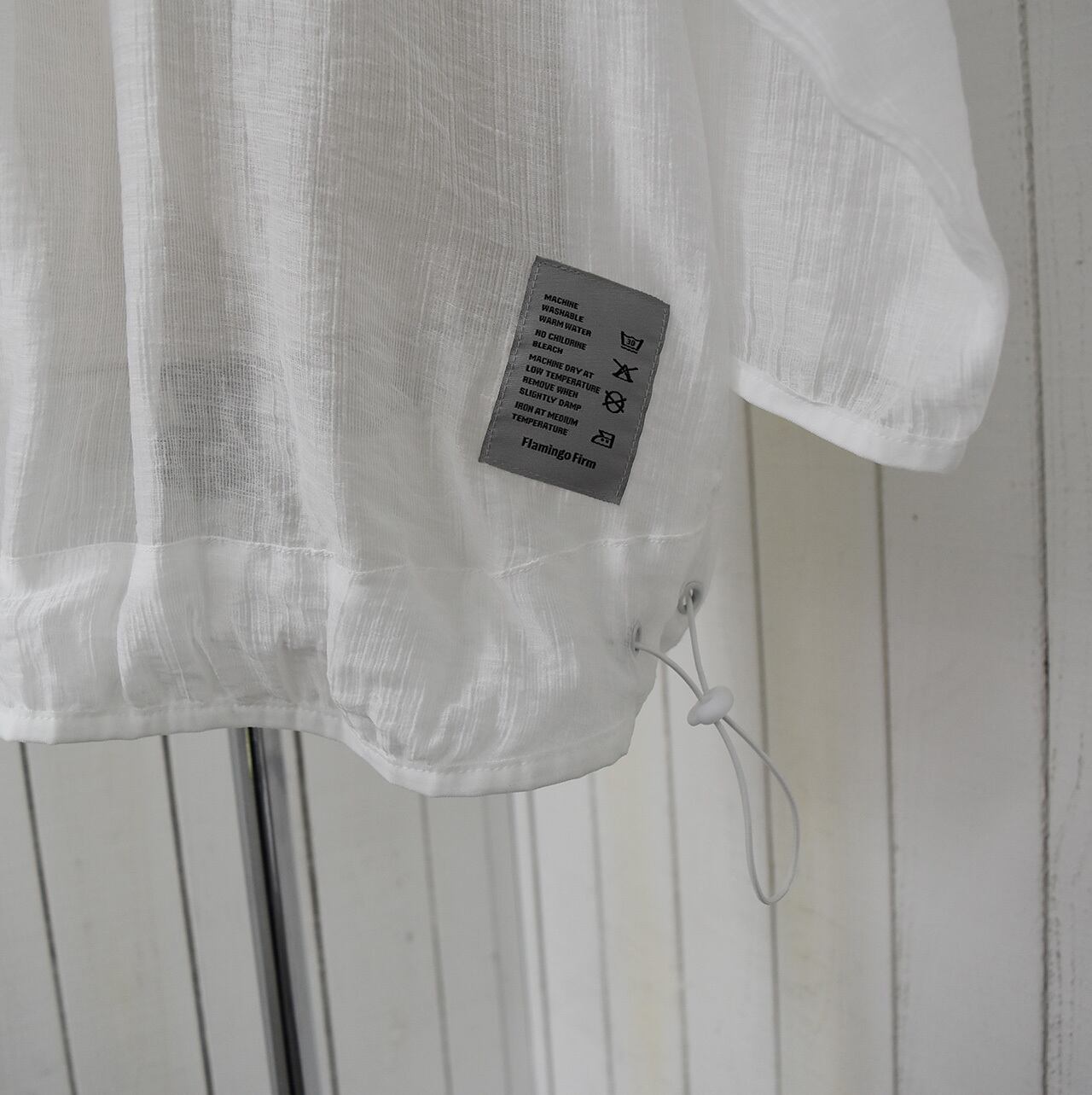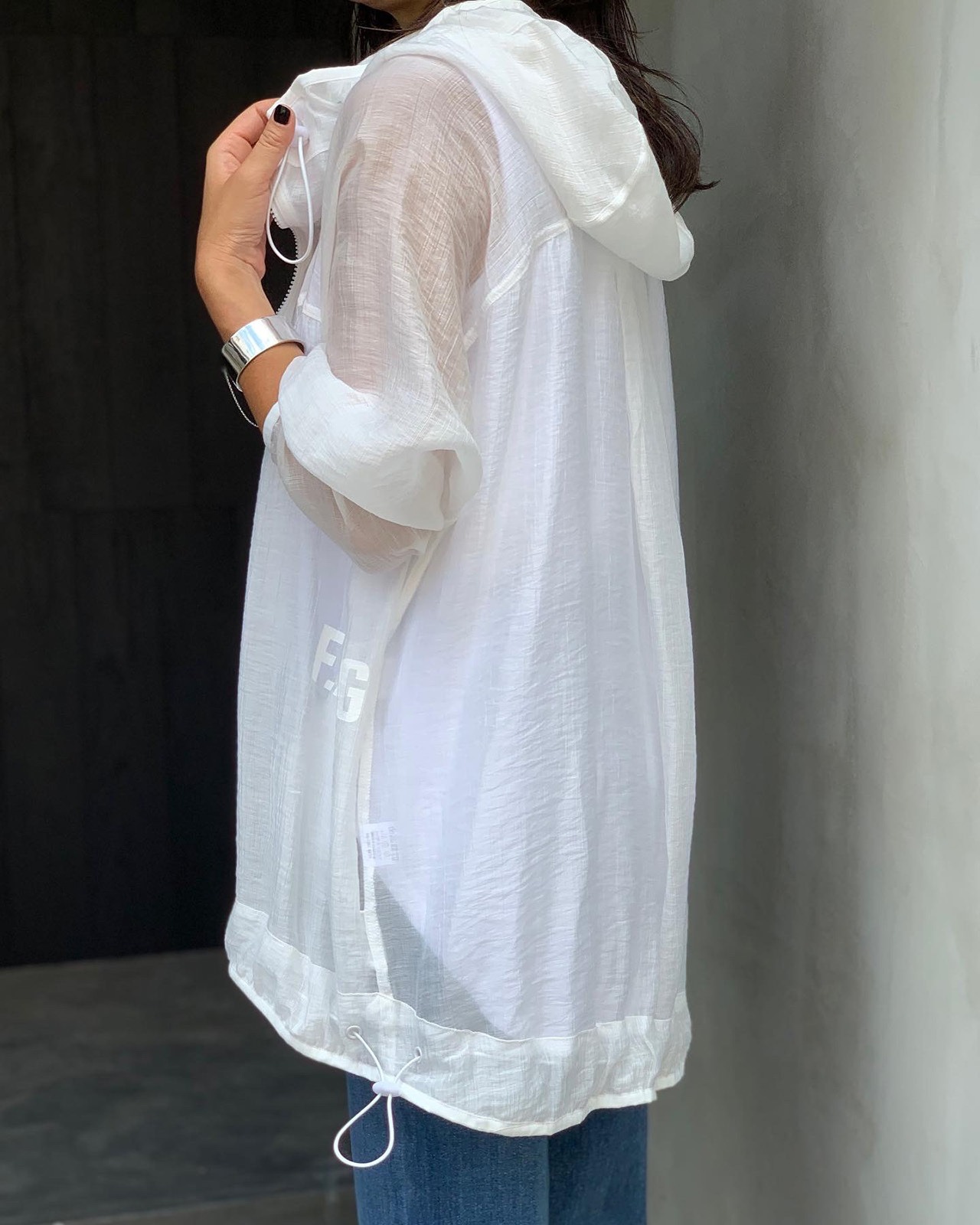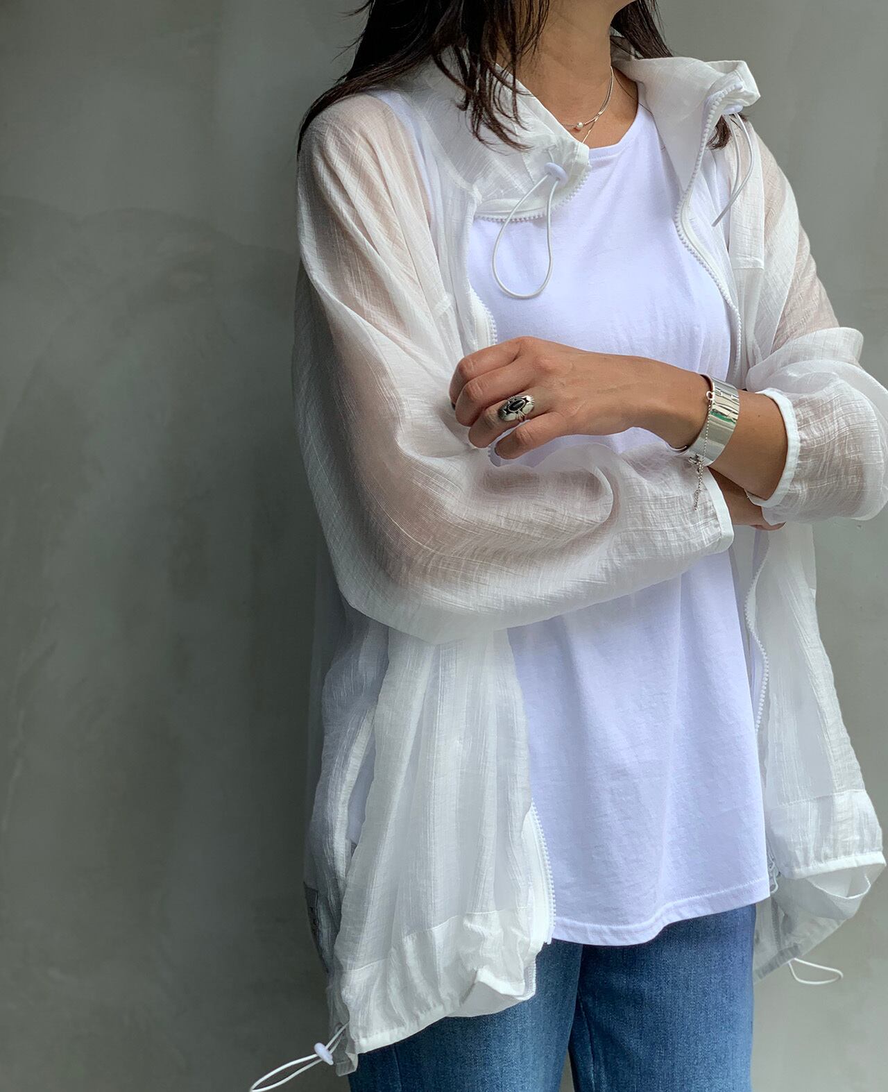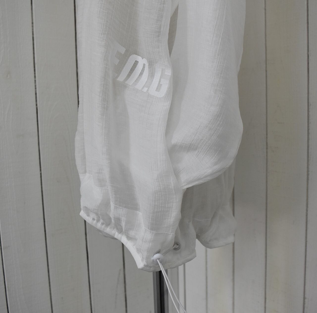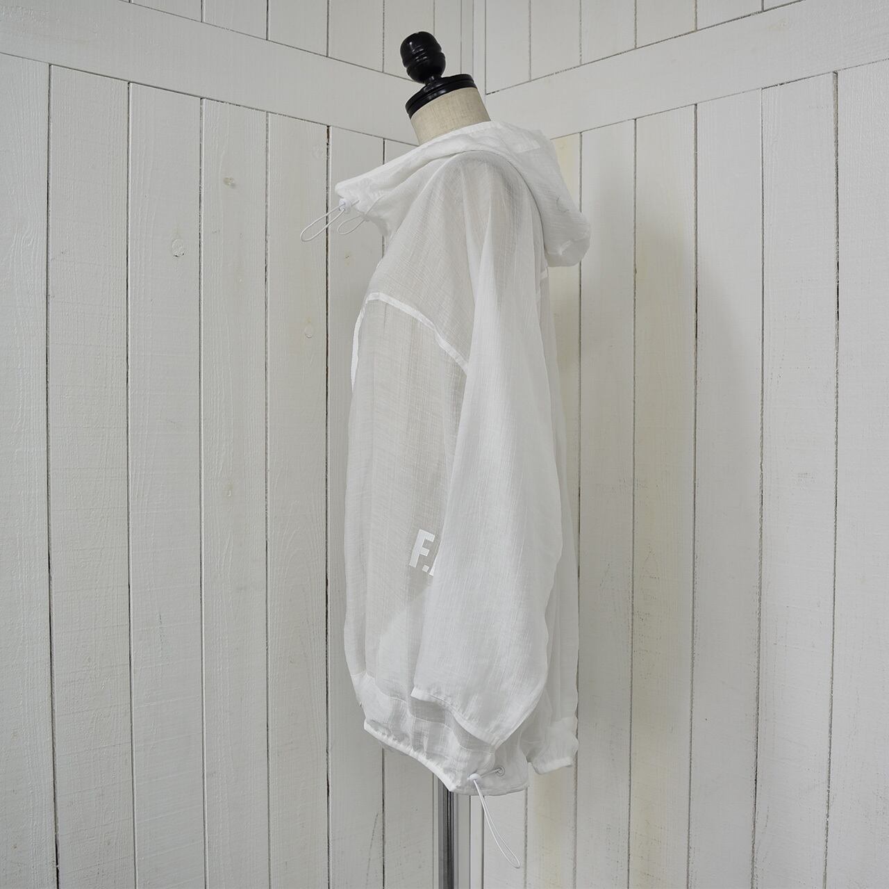 これからの季節に1つ持っていると重宝するシアーパーカーブルゾン。冷房対策や日よけに使えとても軽く、コンパクトになるので持ち歩くのにも最適です。サイドに入ったロゴもシアー素材のポイントになっています。カラーはホワイトのみになります。