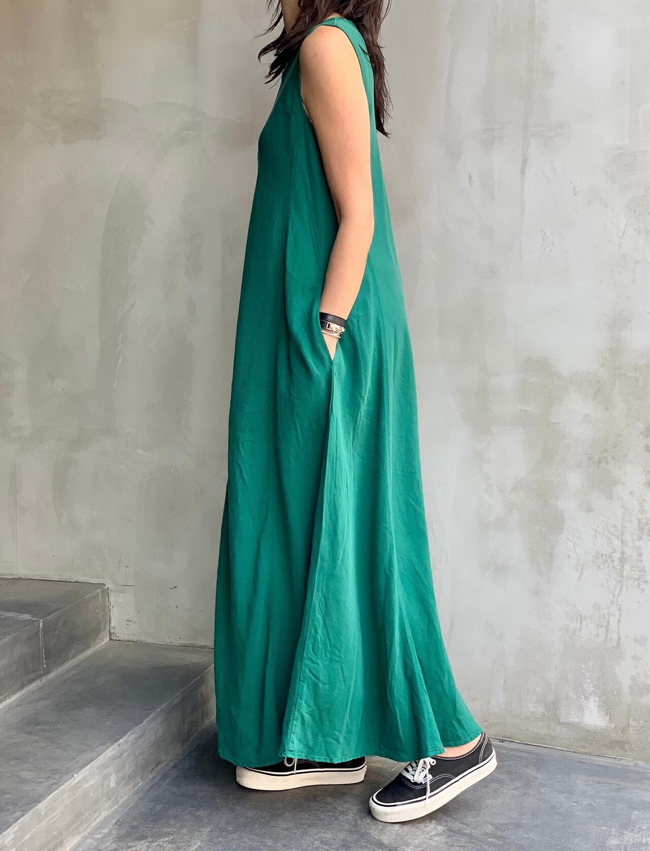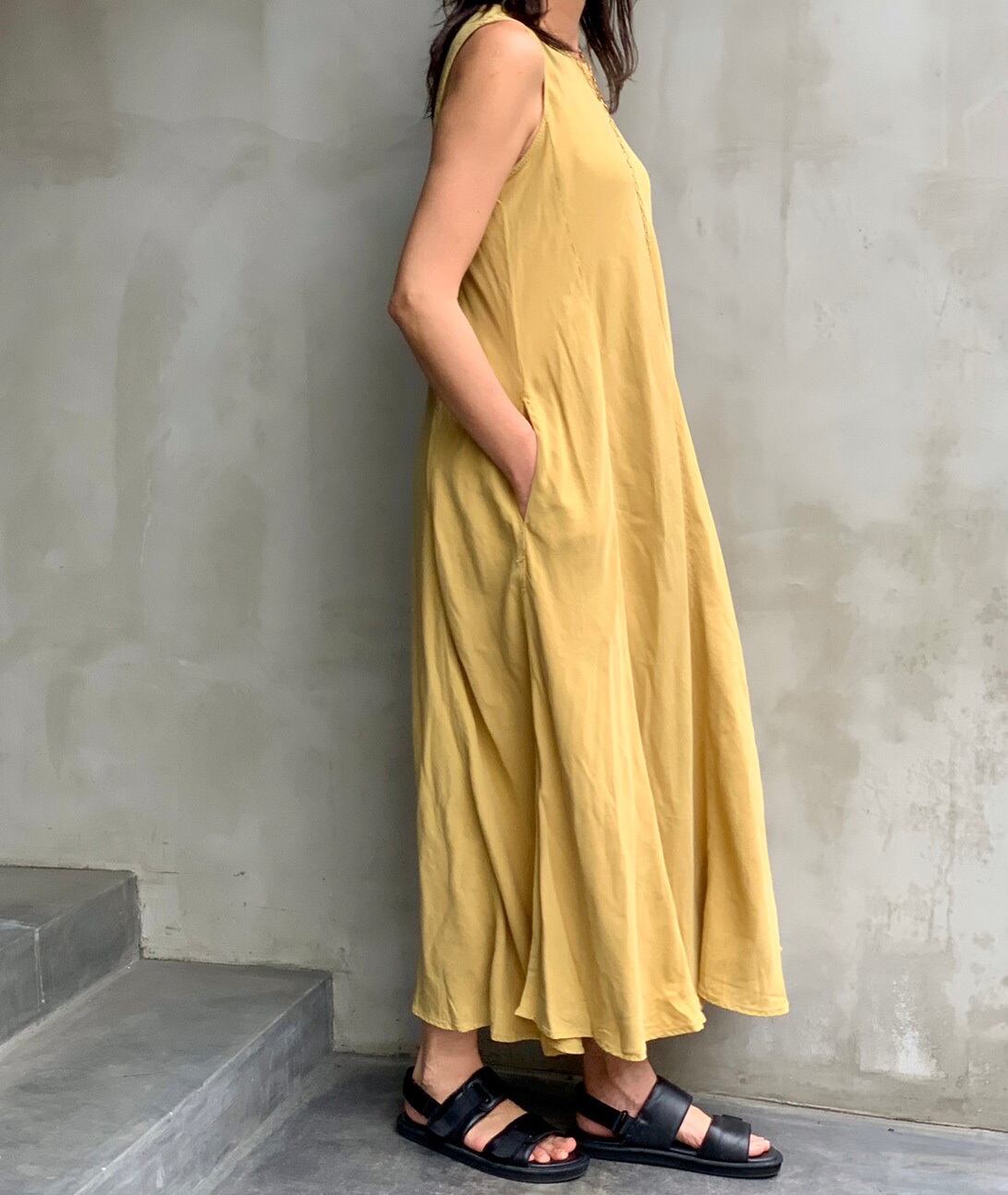 しなやかな素材のテンセルピケ のノースリーブワンピース。1枚でさらっと着ていただけ、シンプルなデザインですのでアクセサリーや羽織る物で色々な表情をお楽しみいただけます。カラーはベーシックなオフベージュ、ブラックとイエロー、オレンジ、ブルーグリーンのビビットなカラーの5色展開です。