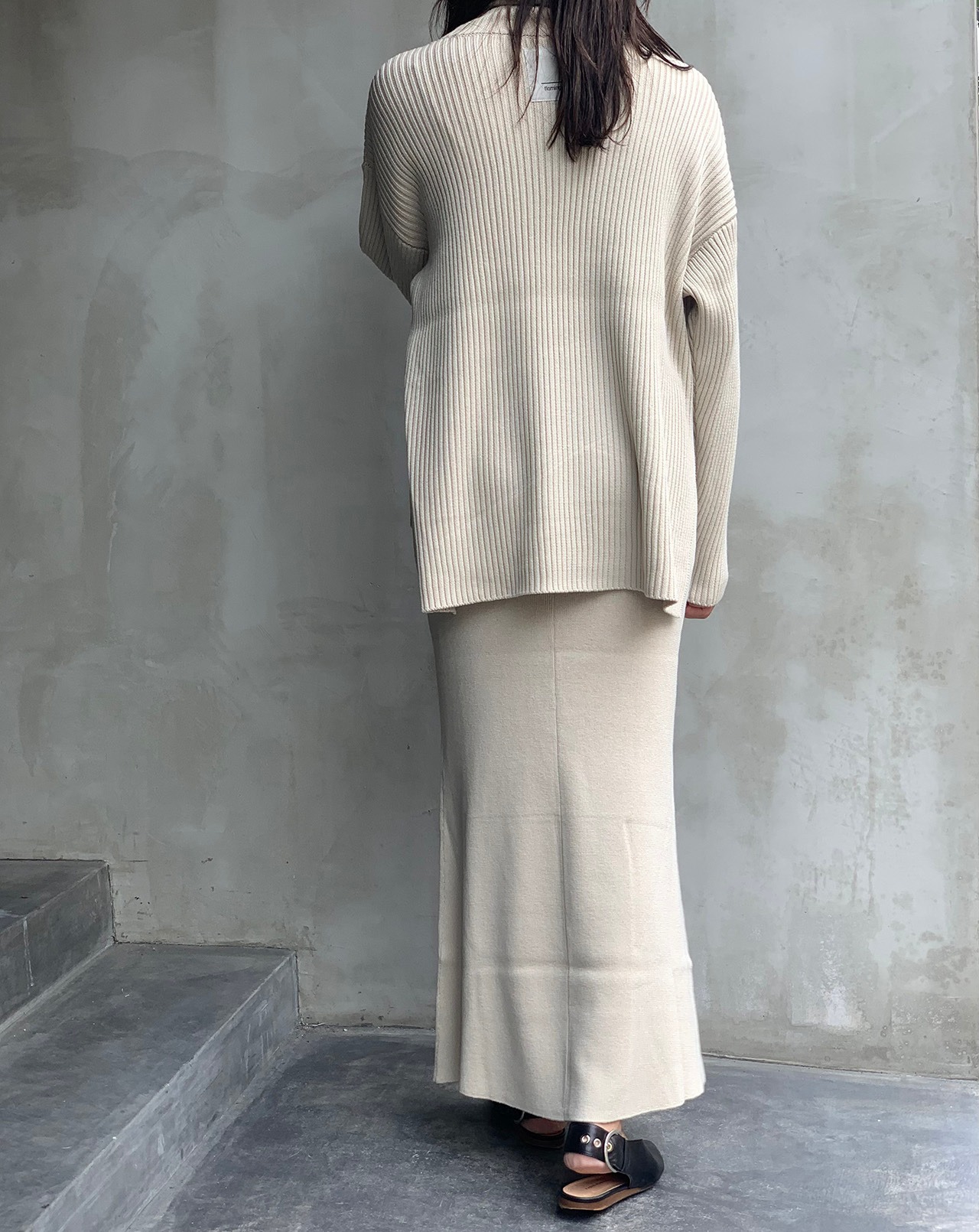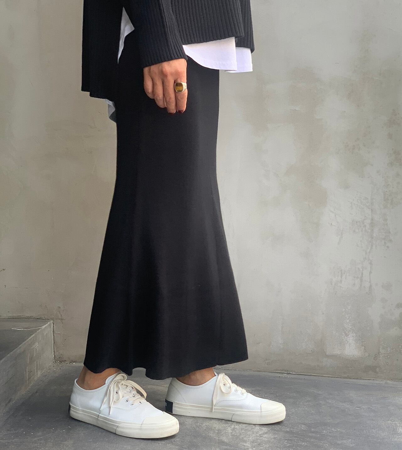 ラインの綺麗なマーメイドスカート。ヒップ 周りはタイトめのデザインですが柔らかい素材ですのでとても履きやすくなっています。同色のトップスとセットアップで人気のアイテムです。カラーはオフ、ピスタチオ、杢グレー、ブラックの4色展開になります。