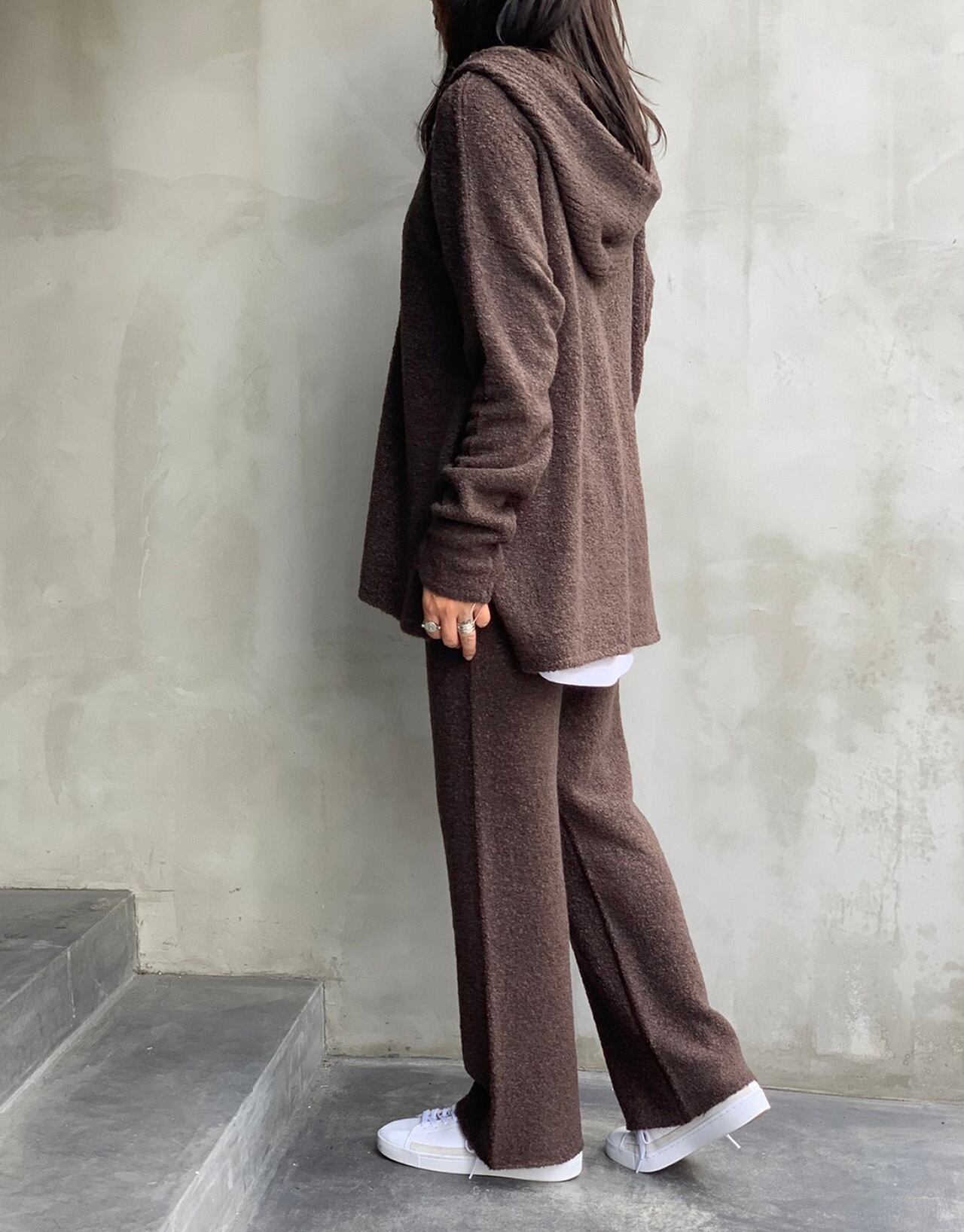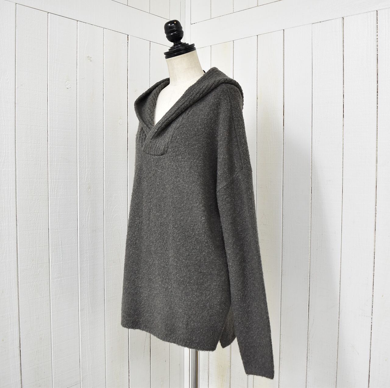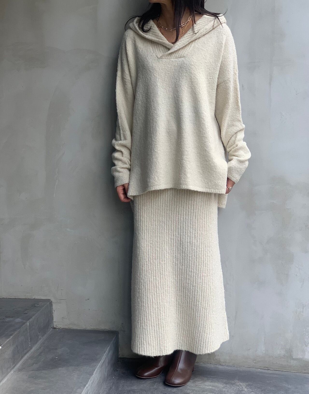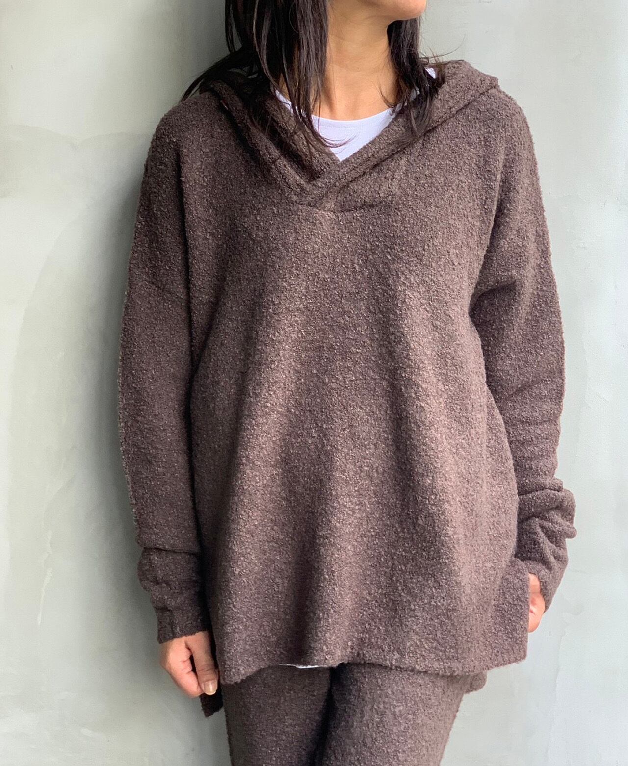 暖かく軽いブークレーニットフードプルオーバー。カジュアル見えするニットでラフに着ていただけます。素材のスカートとパンツでセットアップもおすすめです。カラーはオフ、グレー、ダークブラウン、チャコールの4色展開になります。
