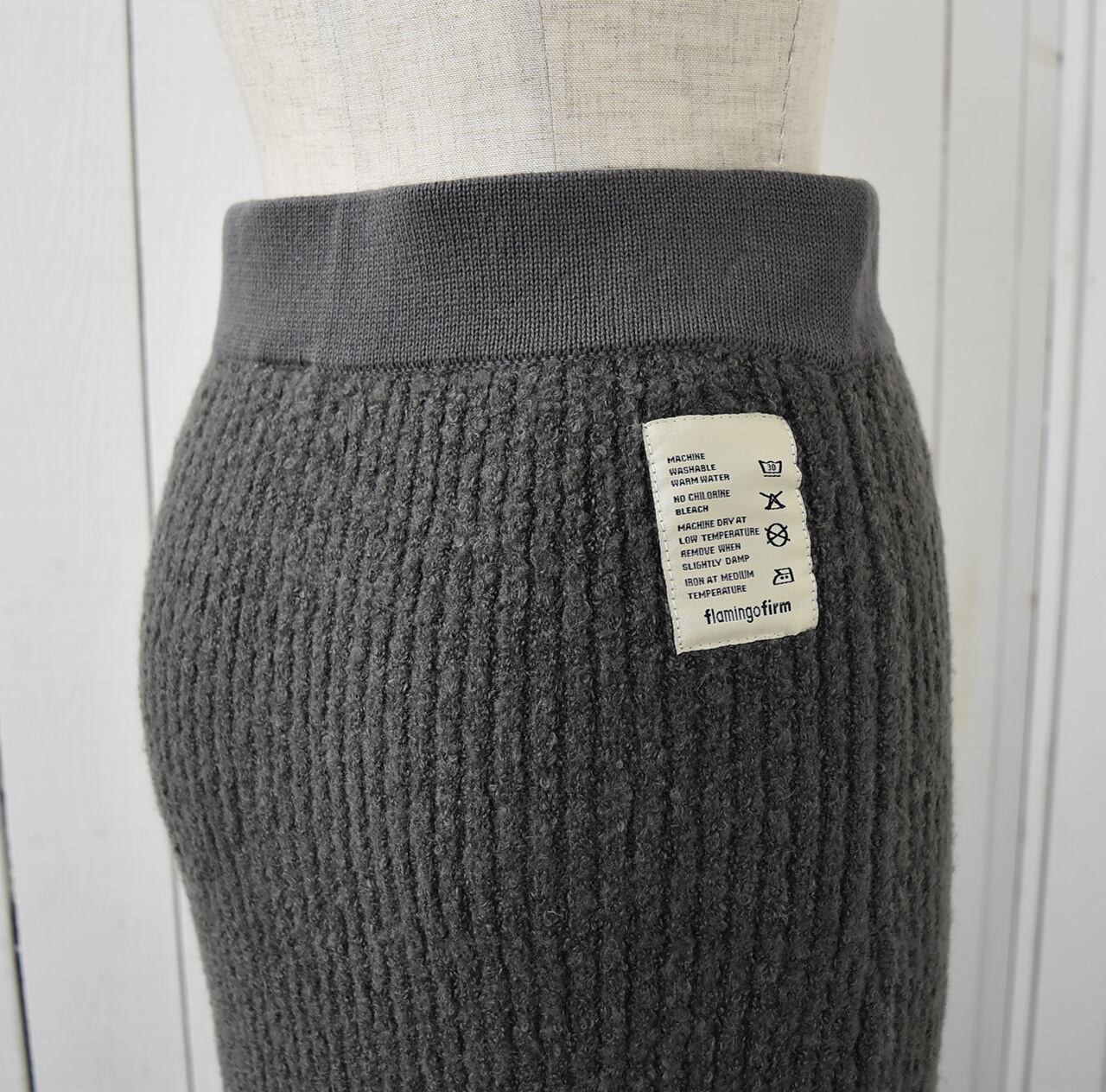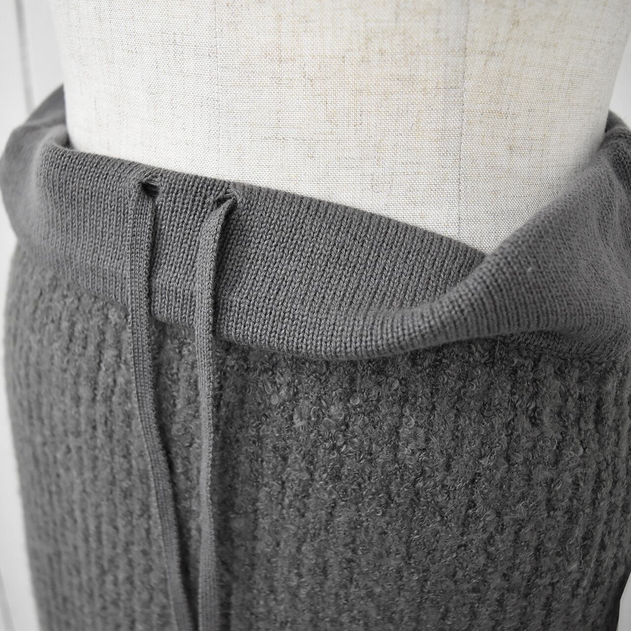 ふんわり柔らかい素材のブークレーマーメイドスカート。ヒップ から腿にかけてタイト目のシルエットで膝下からフレアーになっていますので長めのトップスともバランス良く着ていただけます。同素材のオフタートルとプルオーバーパーカーとのセットアップもおすすめです。カラーはオフ、グレー、ダークブラウン、チャコールの4色展開になります。