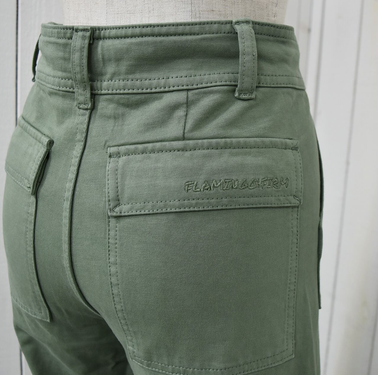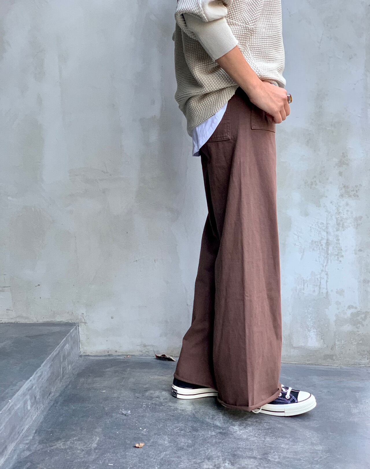 ストレッチの効いた度詰天竺素材を使用したバギーパンツ。ヒップ辺りはタイトにし、裾にかけてワイドシルエットになっていますので足長効果が期待出来ます。ウエスト 部分は少し大きめになっていて内側の紐で調節可能。バリエーションはS、M、Lの3サイズ石灰、スモーキーグリーン、ブラウン、ブラックの4カラーになります。
