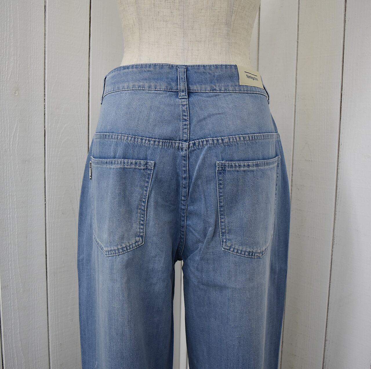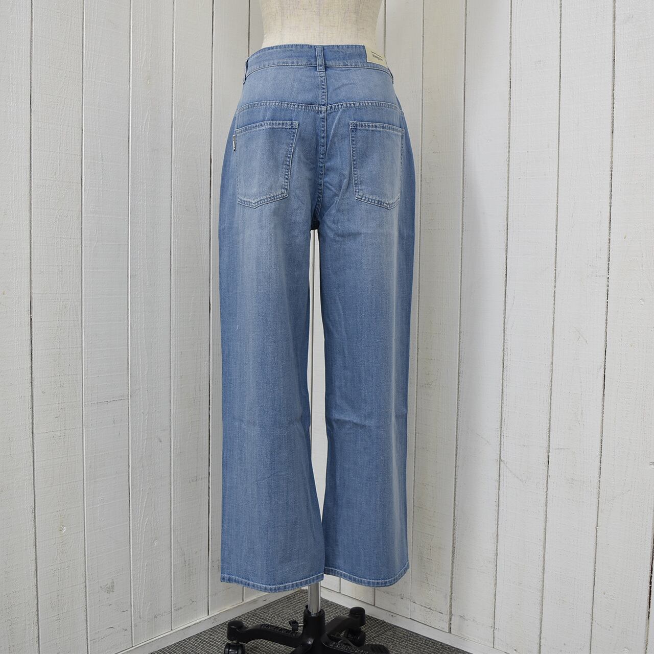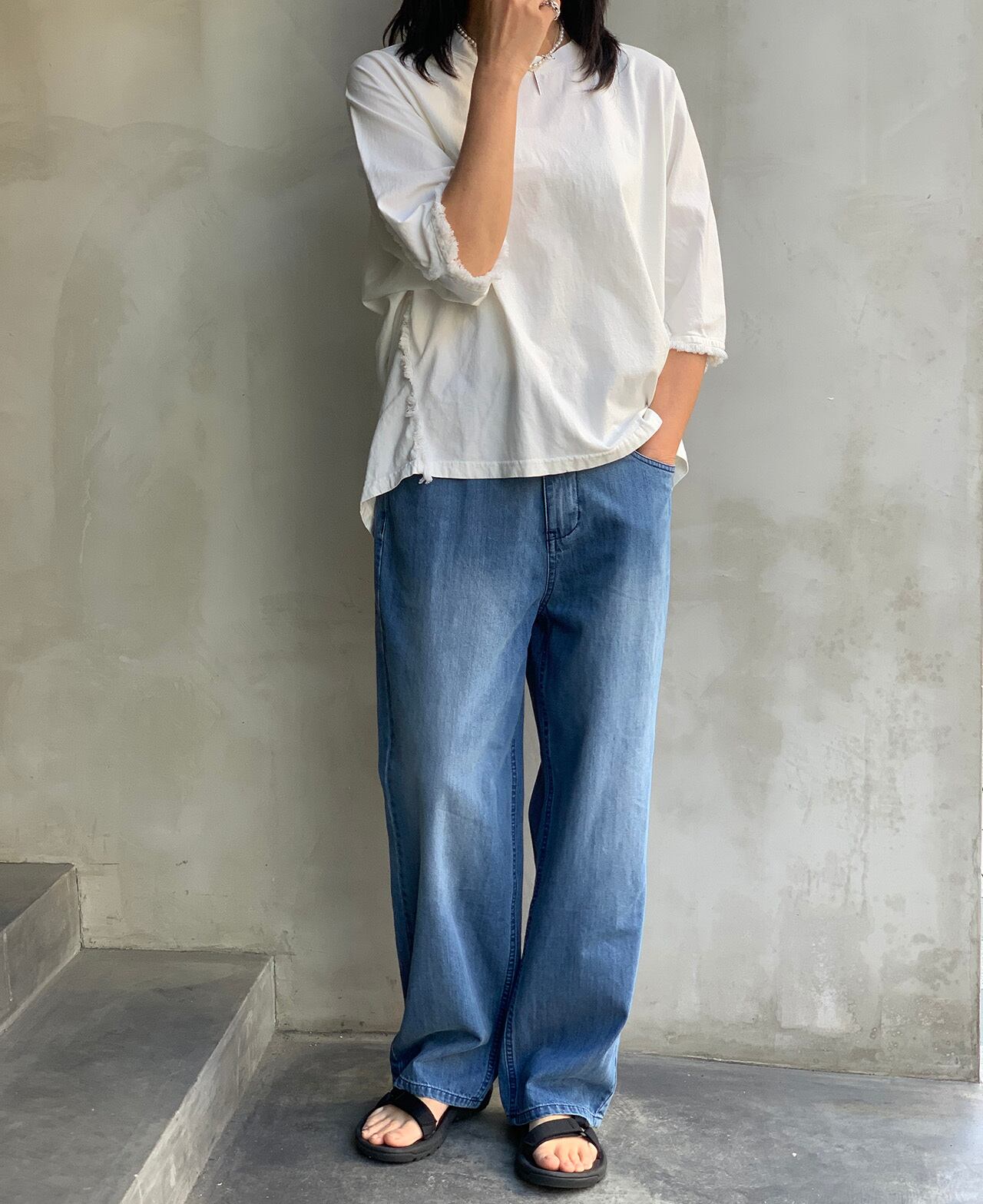 薄手のコットン素材のツイル(オフ)/デニム(ブルー2色)のワイドパンツ。緩めのサイズ感なので涼しく、暑くなるこれからの季節にぴったりなワイドパンツです。3サイズ展開ですがスタッフ166㎝でも全て着用出来ます。少しルーズに履いてMサイズくらいでになります。(画像はMサイズ着用で腰履きで履いています)