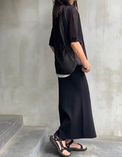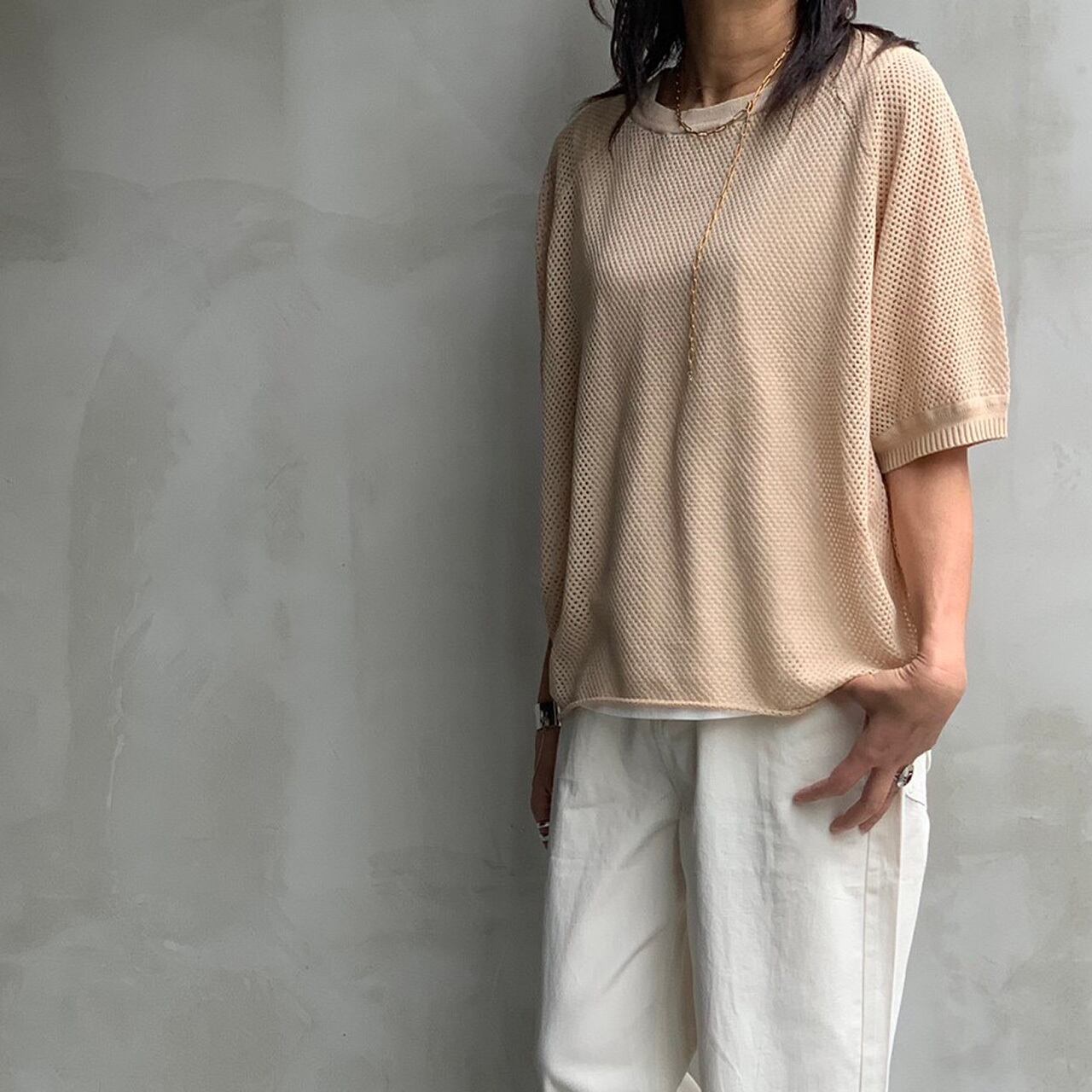 メッシュ半袖ニットとタンクトップのアンサンブルになります。メッシュなので風通しが良く真夏でも涼しく、Tシャツよりも品良くコーディネートが出来るのでおすすめです。