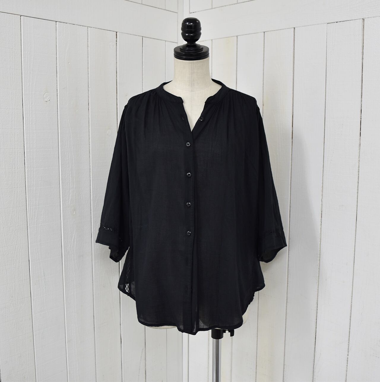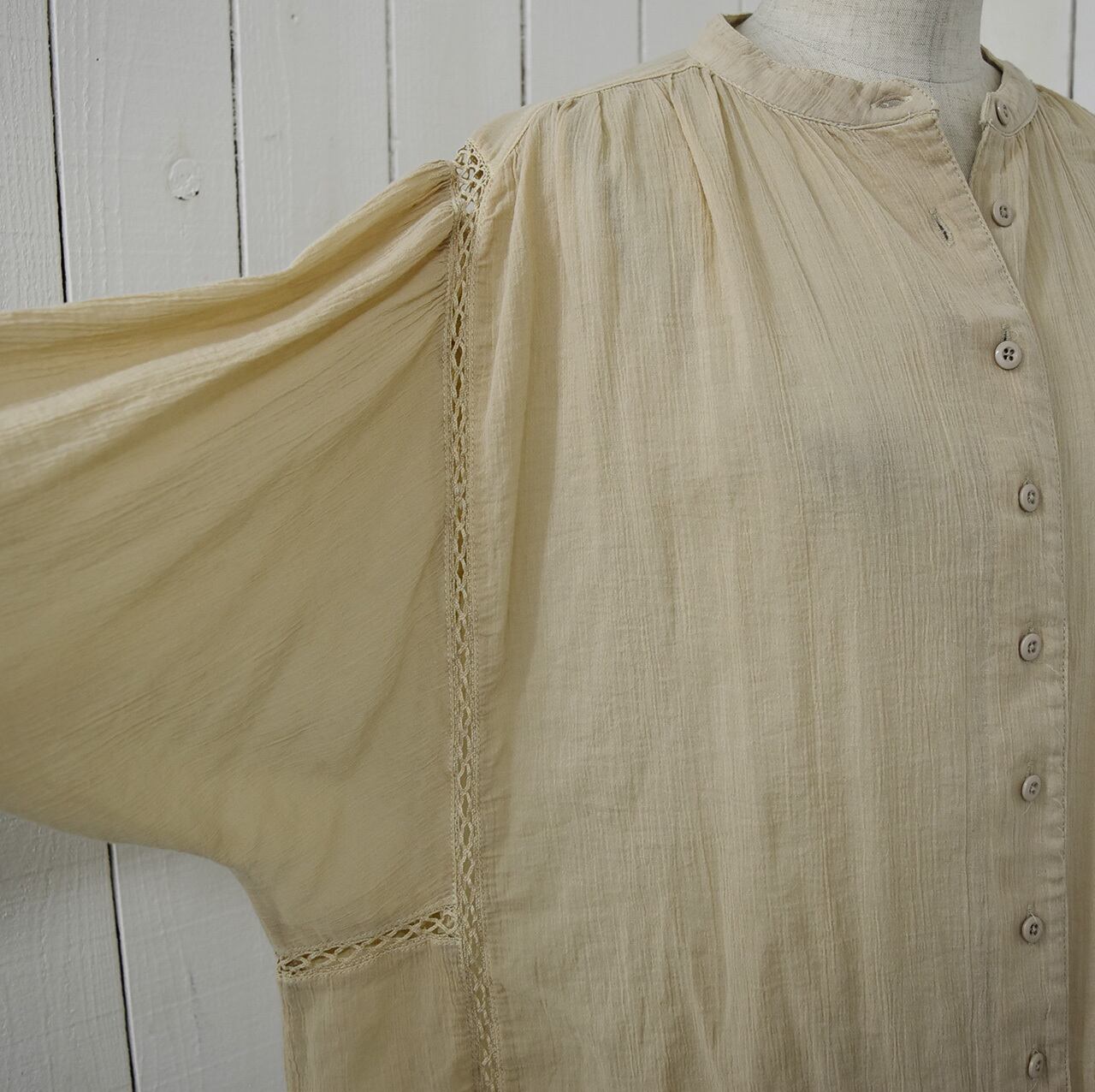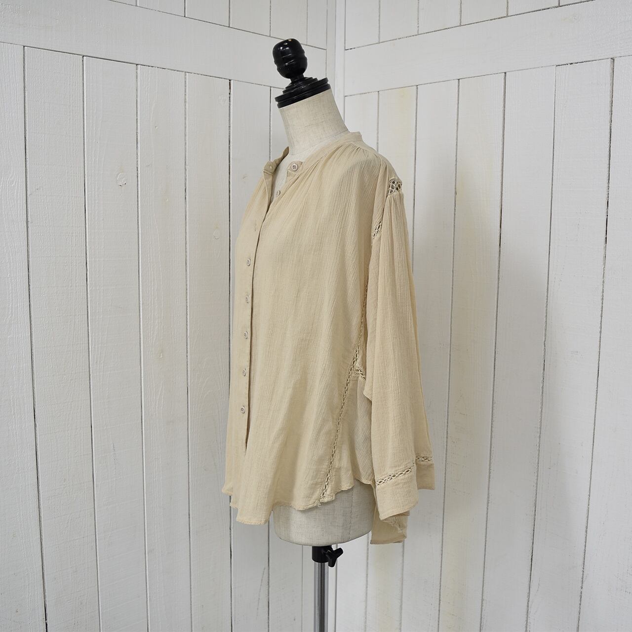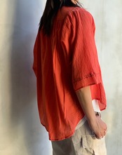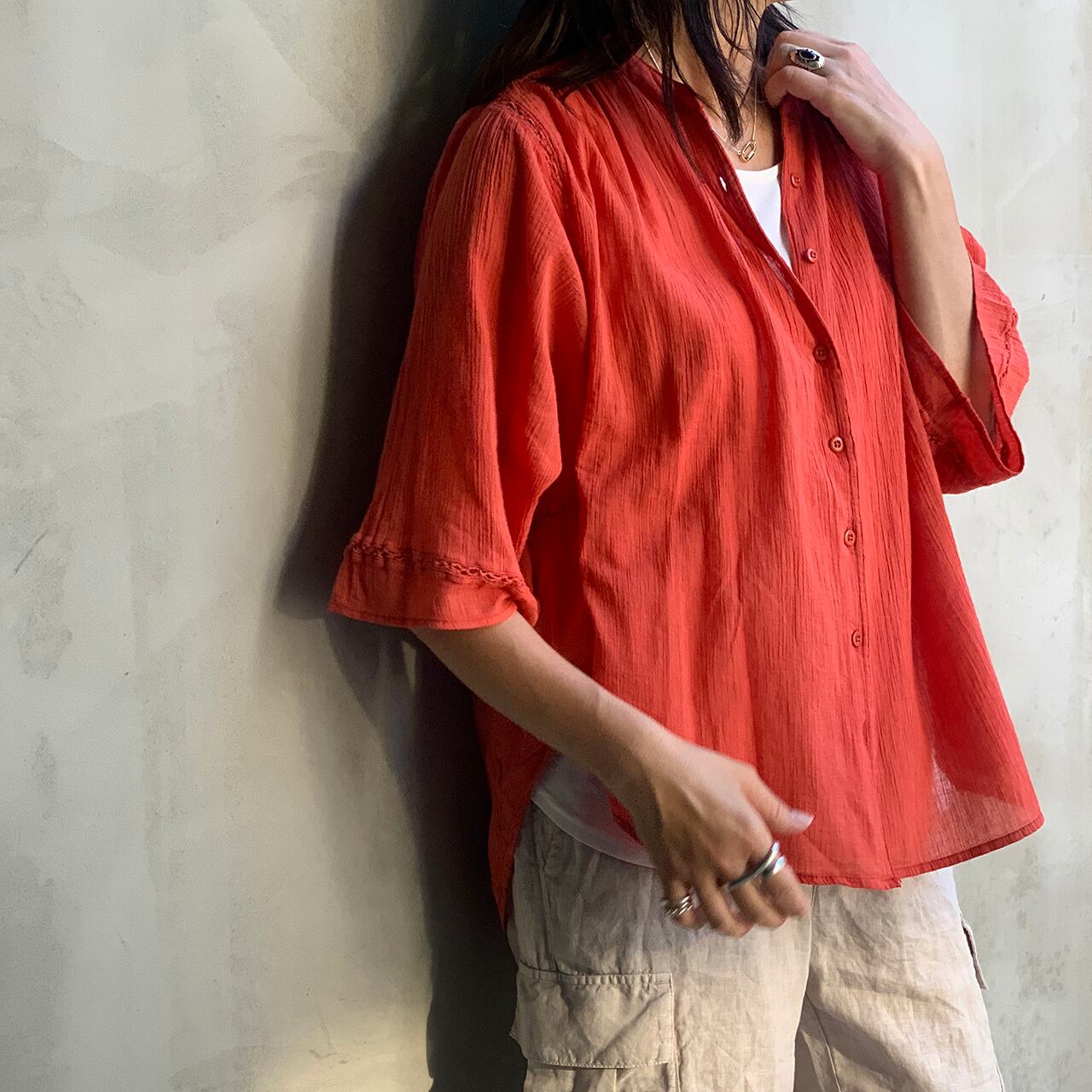涼しげな印象のハシゴレースをあしらった楊柳(シワ加工)シアーブラウス。羽織りとしてもバランスの良いサイズ感ですので日よけ対策や冷房対策になる1枚です。カラーはオフ・サンド・オレンジ・ブラックの4色展開になります。
