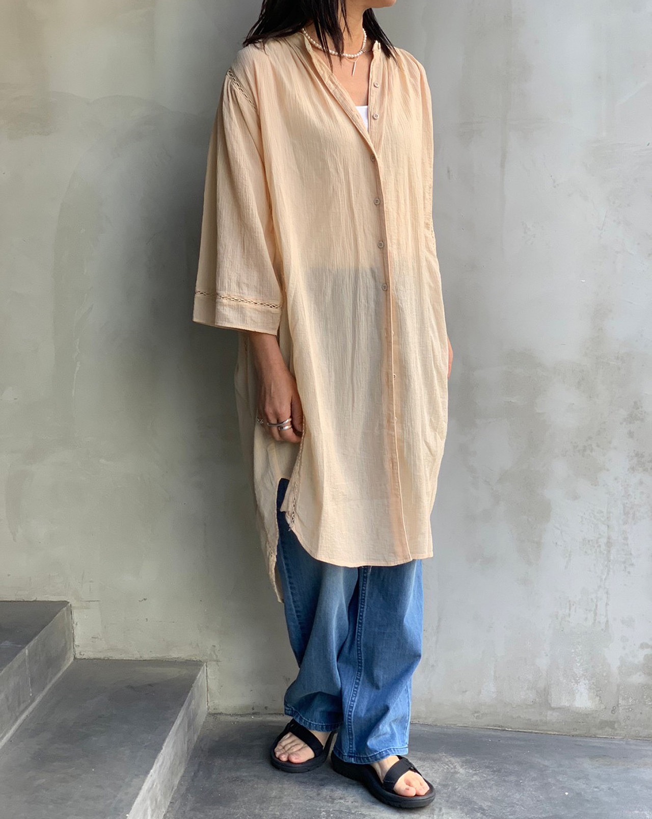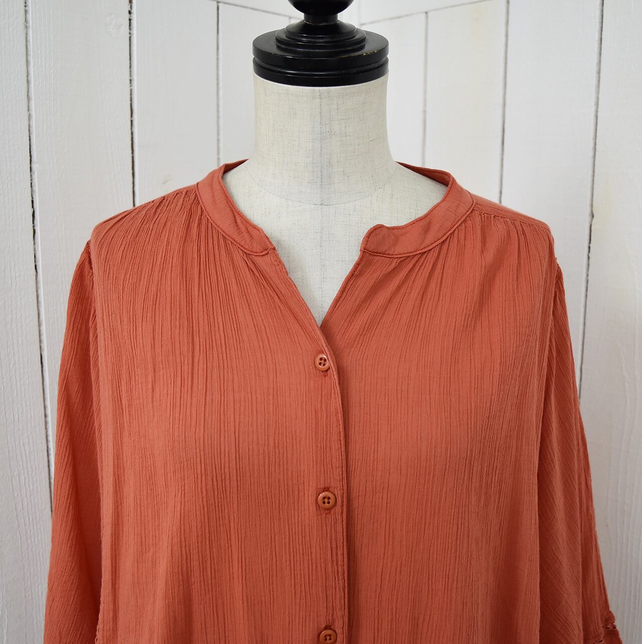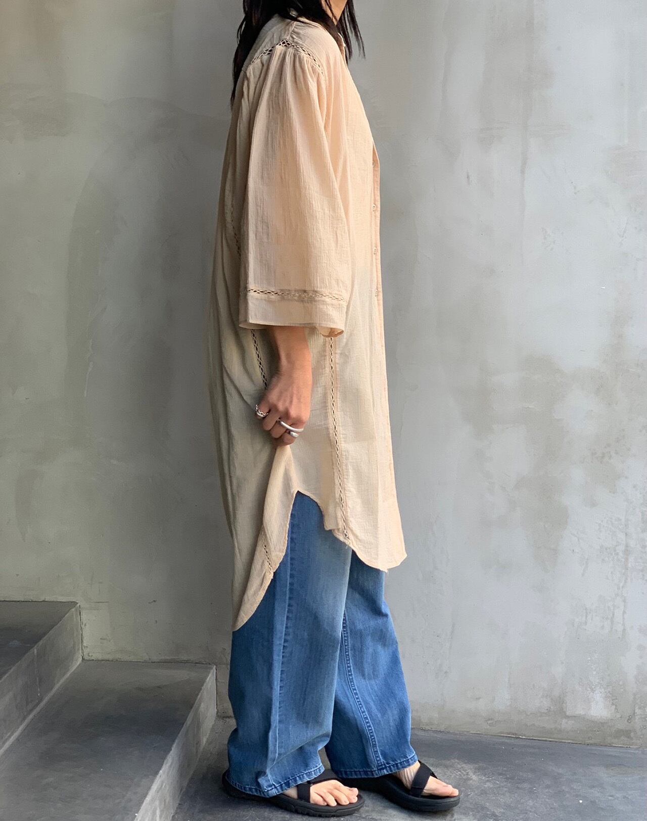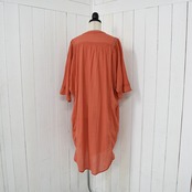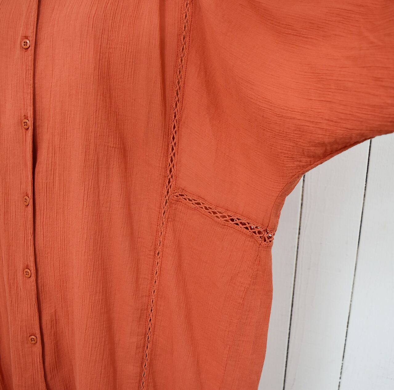 涼しげな印象のハシゴレースをあしらった楊柳(シワ加工)シアーロングブラウス。羽織りとしてもバランスの良いサイズ感ですので日よけ対策や冷房対策になる1枚です。カラーはオフ・サンド・オレンジ・ダークブラウン・ブラックの5色展開になります。