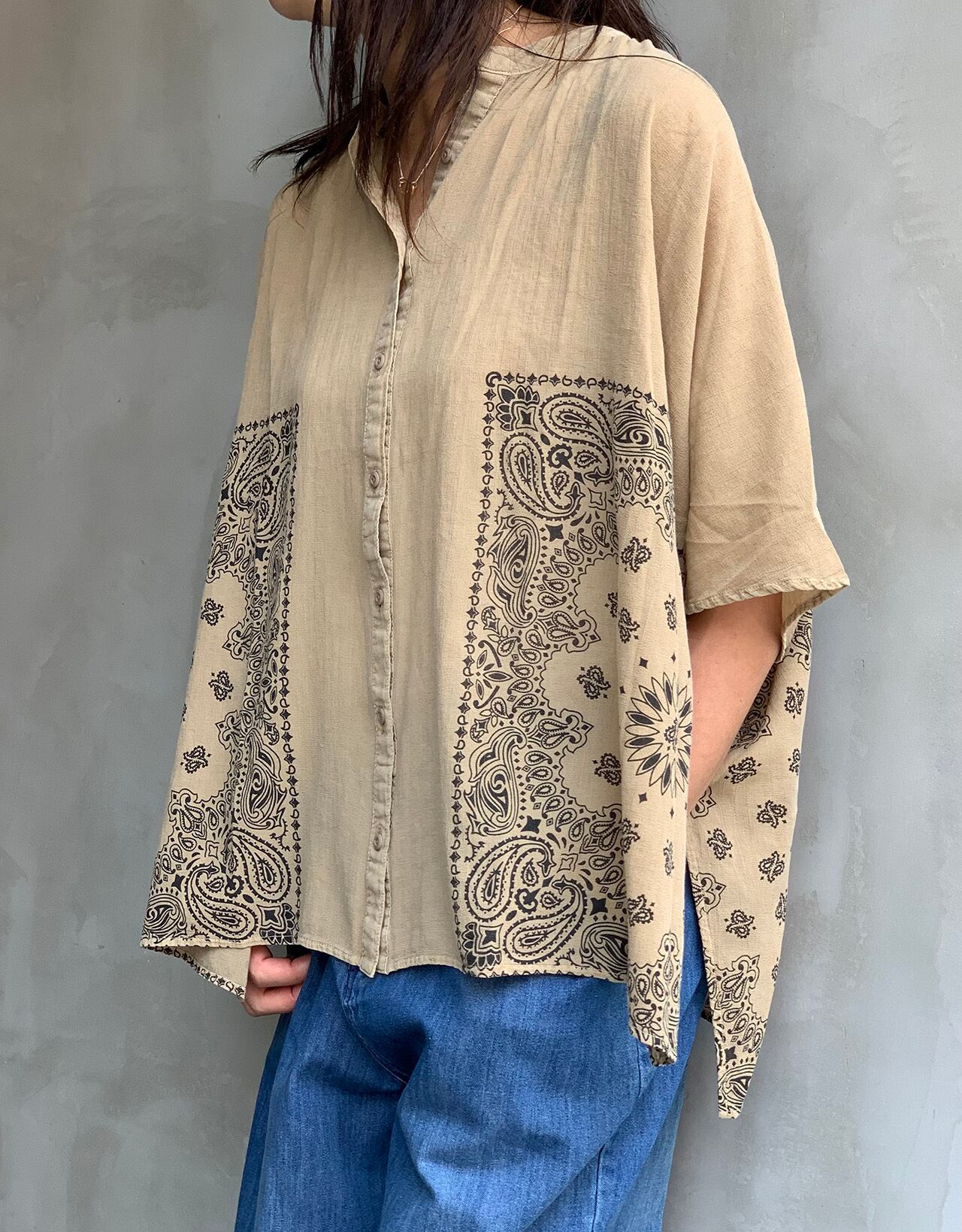 バランス良くバンダナ柄がプリントさせたシアーポンチョブラウス。ゆとりのあるポンチョ型なので夏でも身体に添わず涼しく着ていただけます。カラーはオフ・ベージュ・オレンジの2色展開になります。