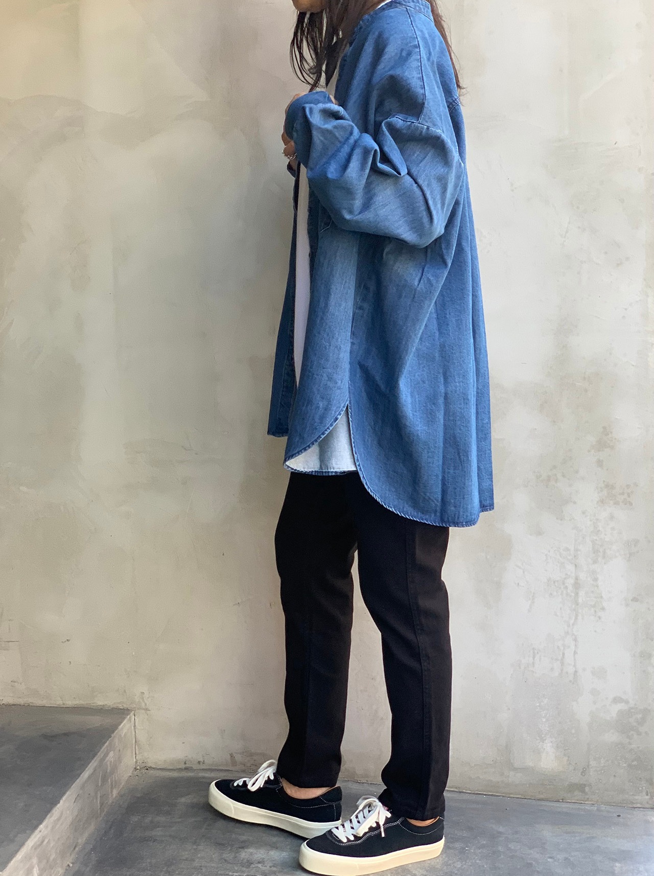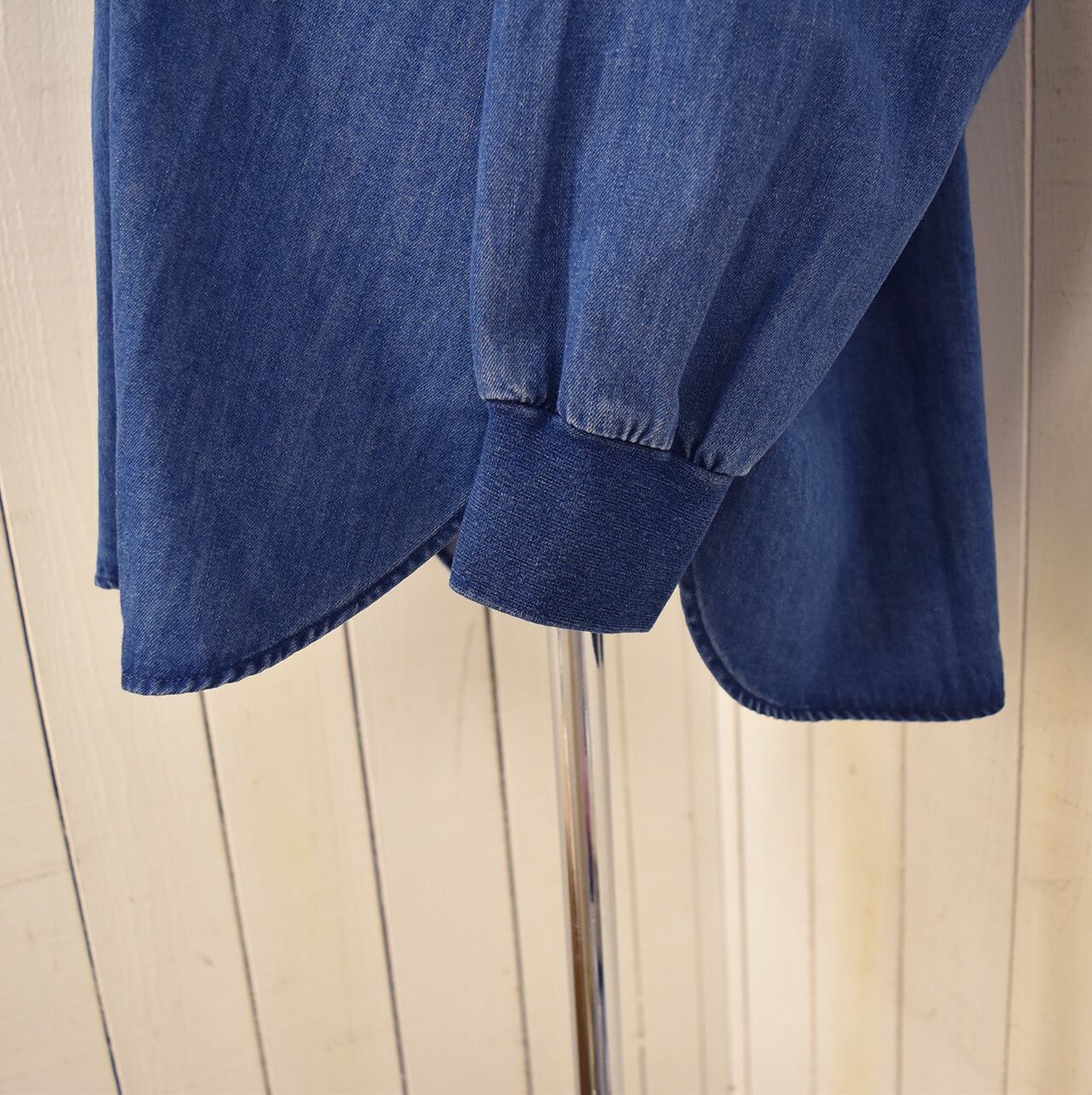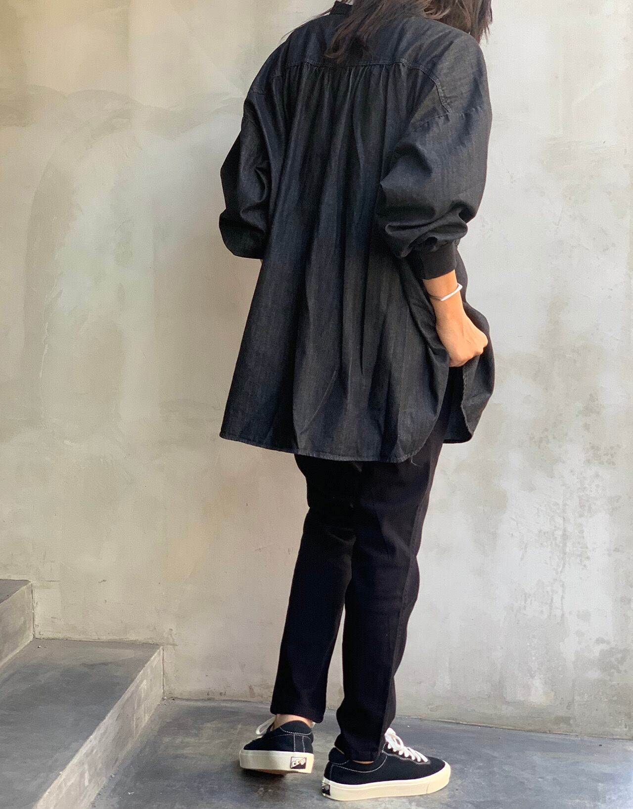 ゆったりしたシルエットの羽織としても使い勝手の良いダンガリーシャツ。背中のギャザーで女性らしさをプラス。中肉でロングシーズンお使いいただけます。カラーはブルーとブラックの2色になります。