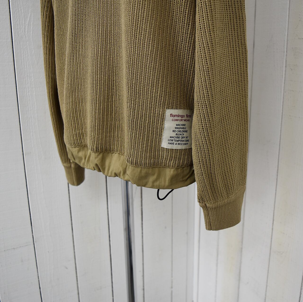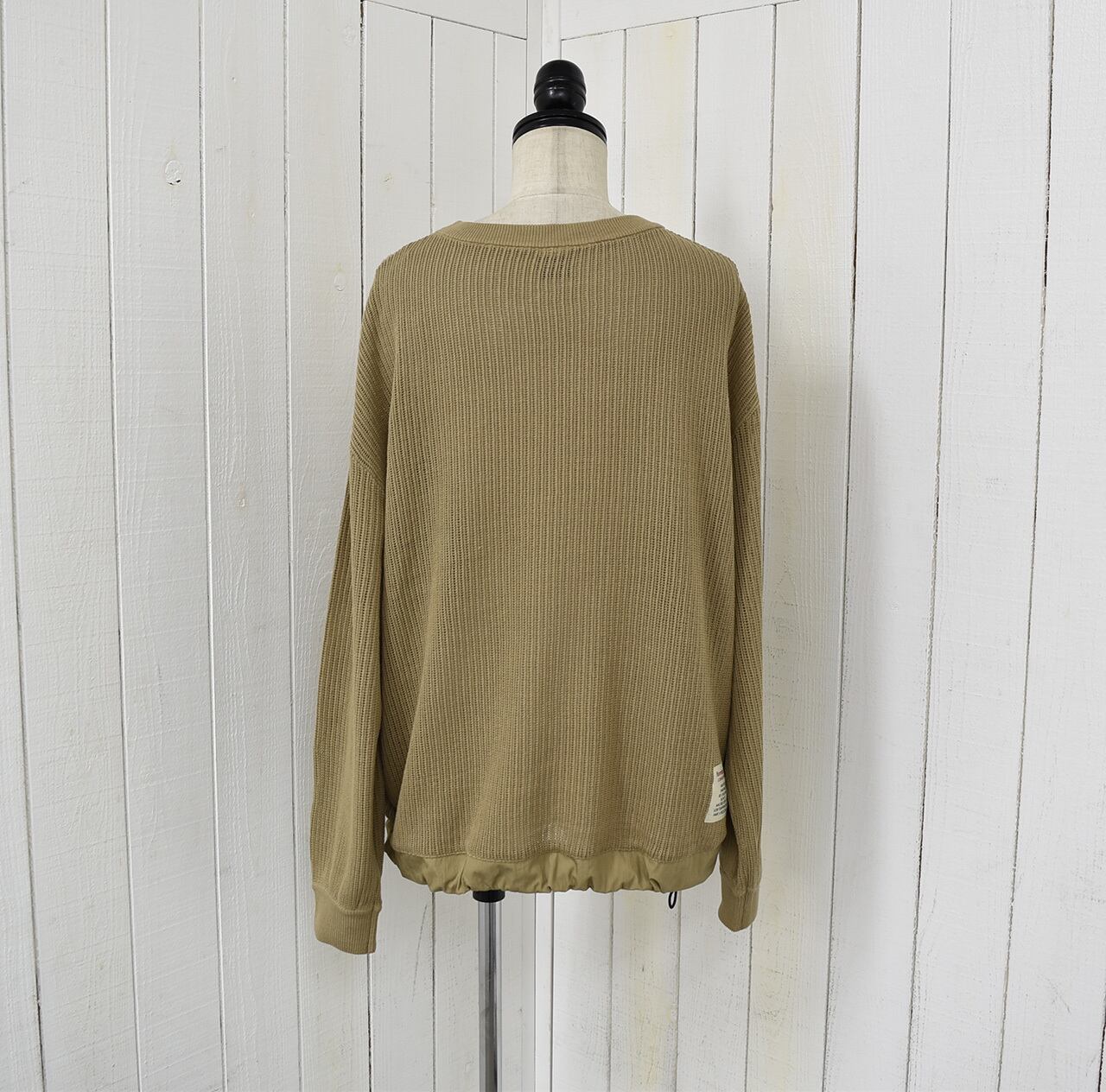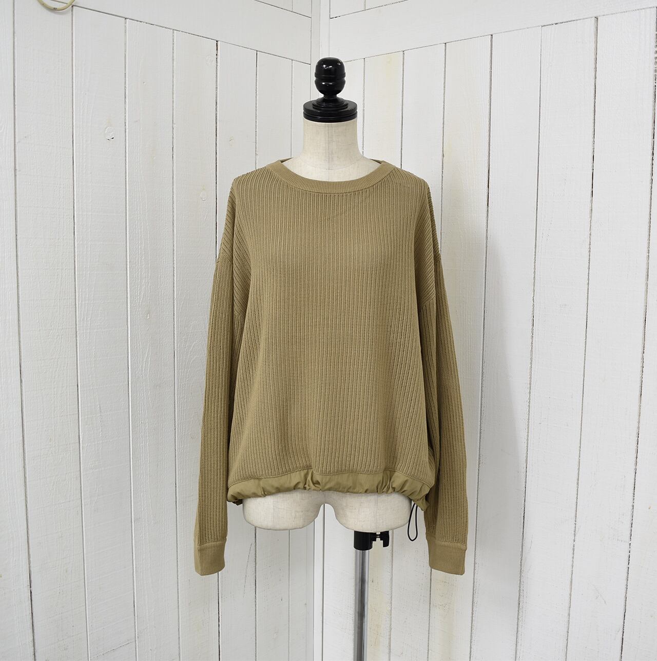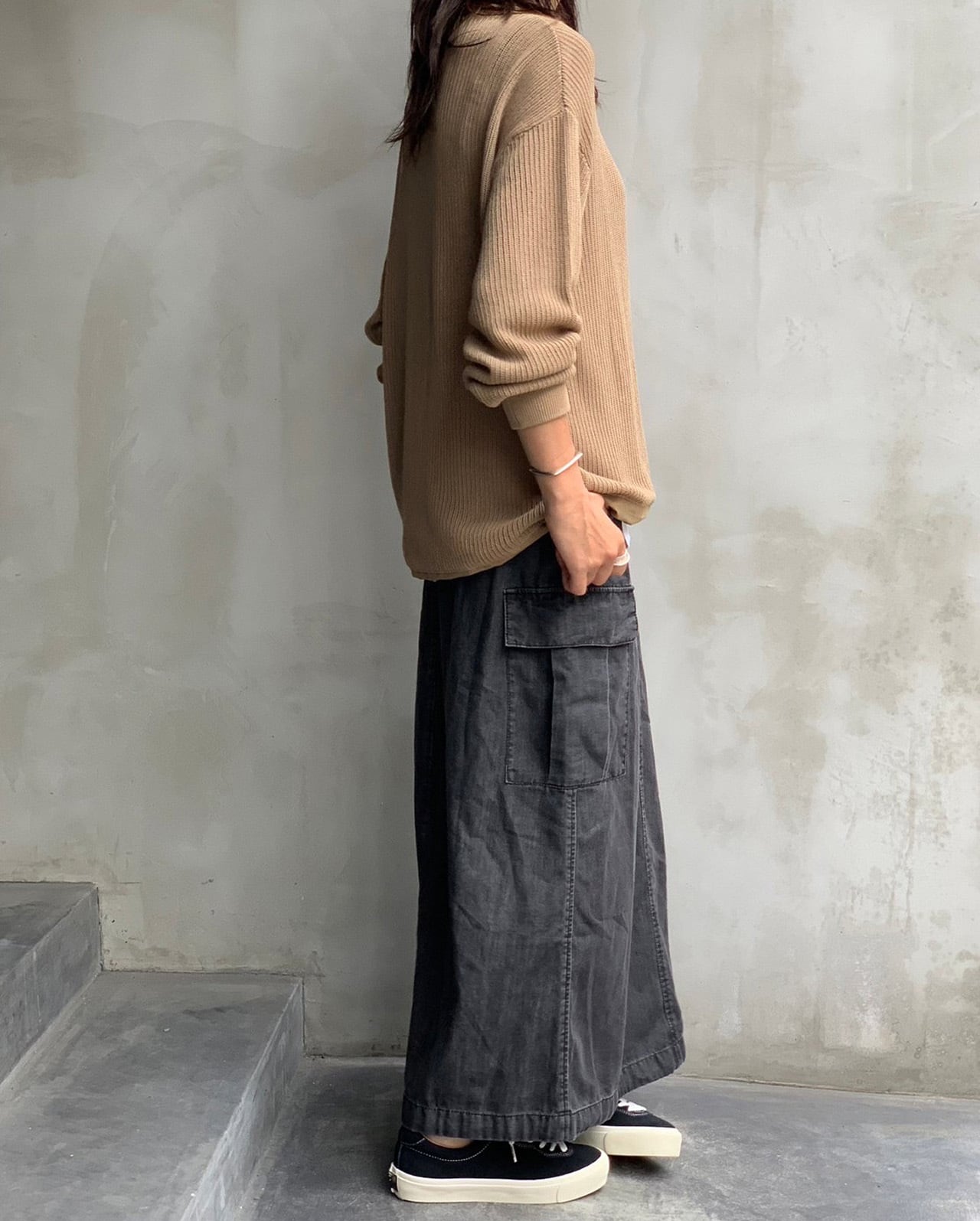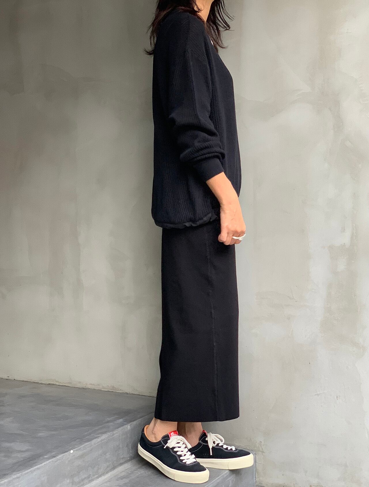 晩夏にぴったりの透かし編みニット。ナイロン素材で切り替えた裾絞りがアクセントになっています。インナーはタンクトップでもロンTでも透け感を楽しめます。セットアップになるタイトスカート もございます。カラーはベージュ・チャコール・ブラックの3色展開になります。