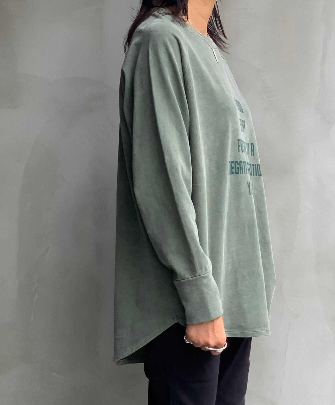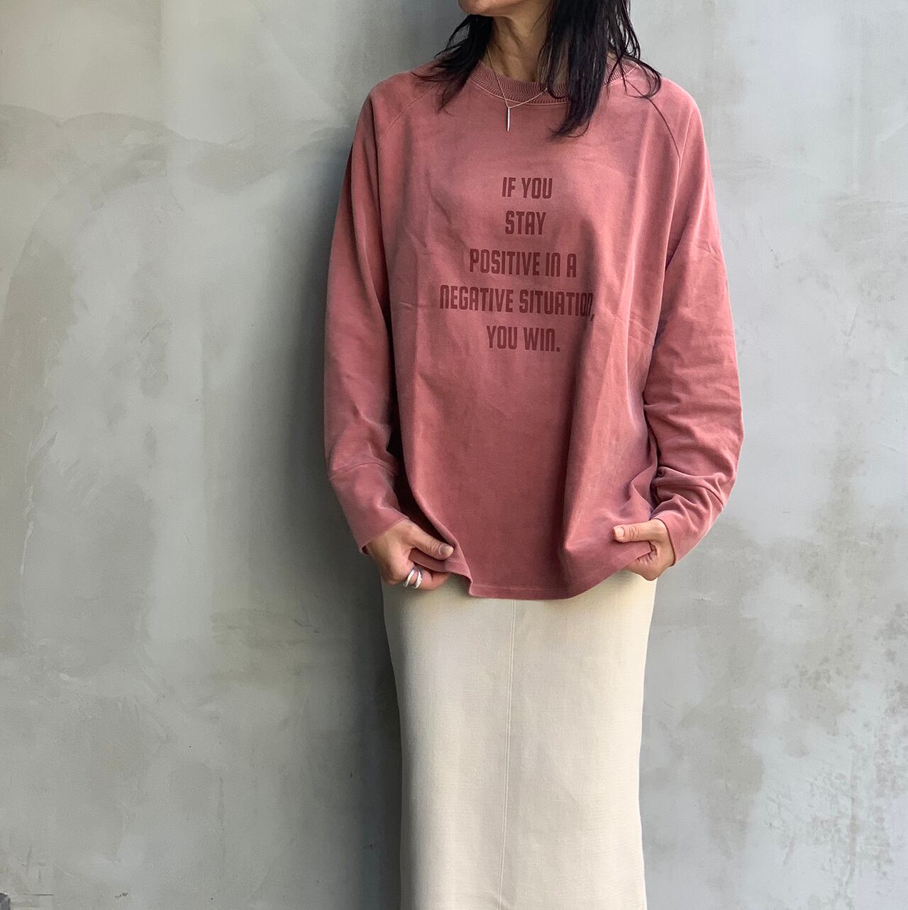 起毛天竺のロゴロングスリーブTシャツ。ゴワゴワせず薄手で暖かいので寒くなる時期に厚手の物を着るのが苦手な方に人気の素材です。ネックのリブ部分は変わり編みでちょっとしたポイントになっています。カラーはサンド・レッド・グリーン・チャコールの4色になります。
