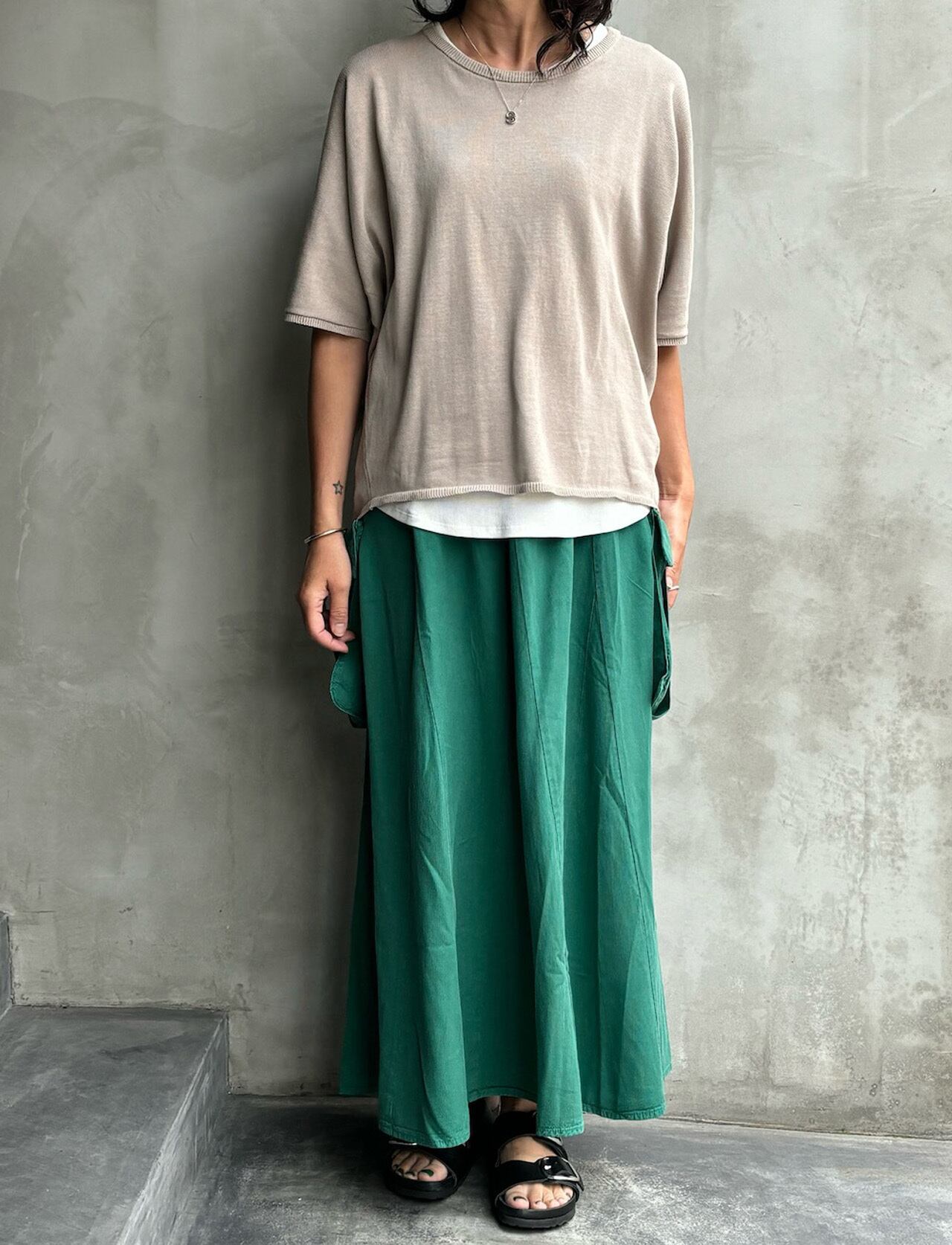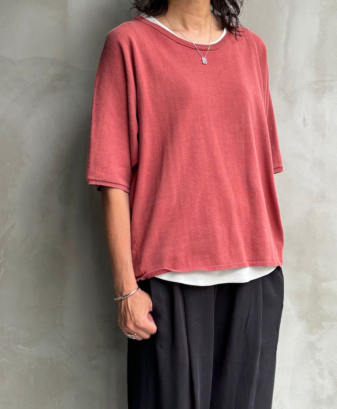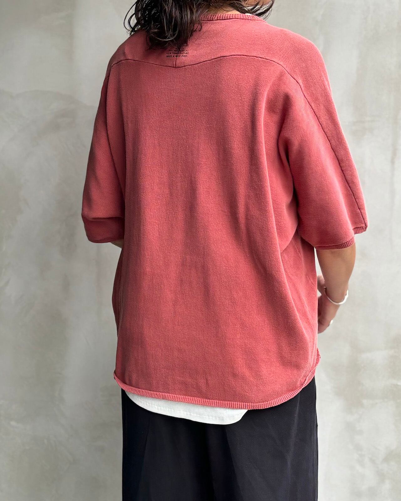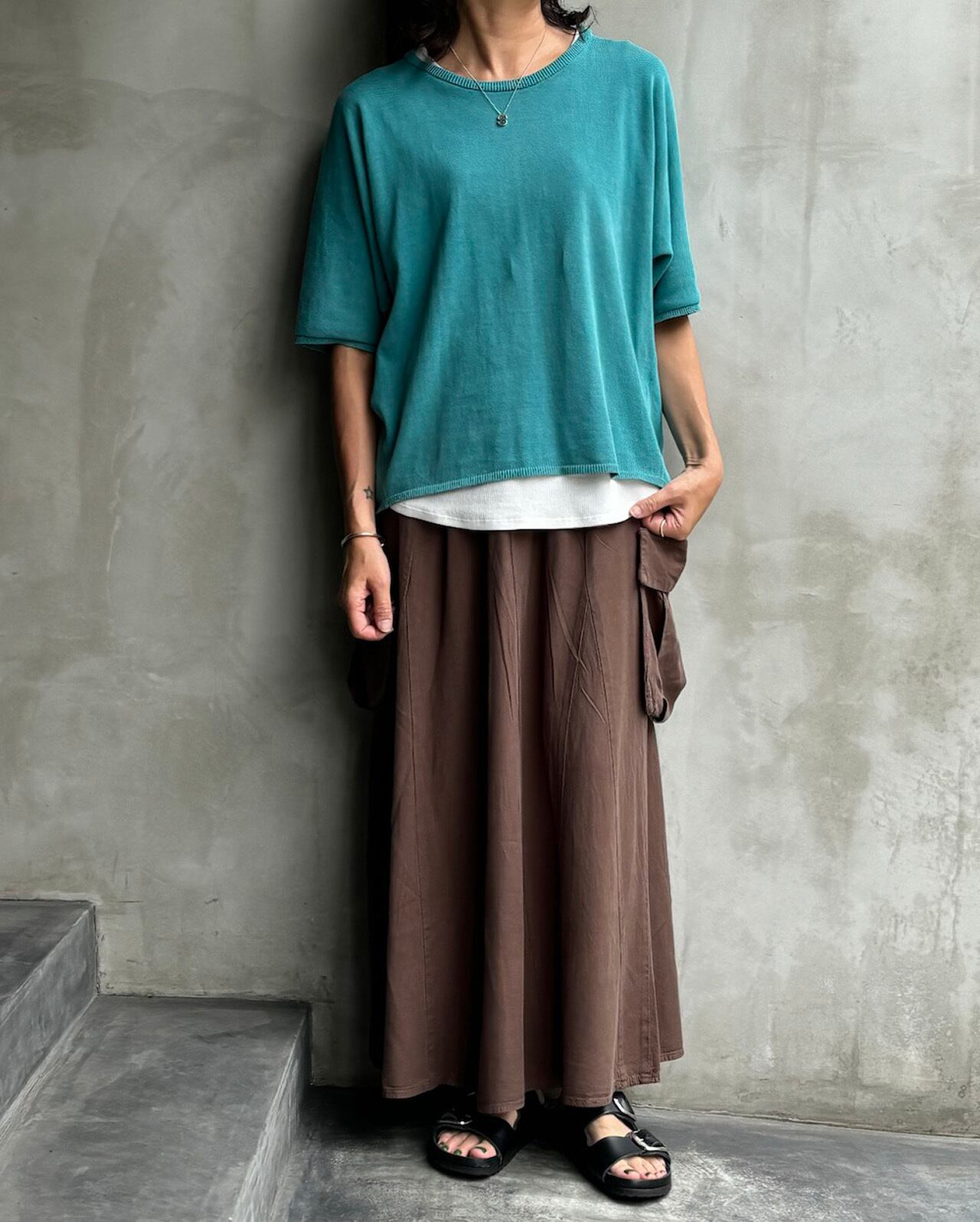 半袖のドルマン袖のニットTシャツ。柔らかく気持ちの良い素材でゆったりしたサイズ感なのでストレスフリーで癖になる着心地です。カラーはサンドベージュ・ダークレッド・ターコイズ・チャコール・の4色展開になります。