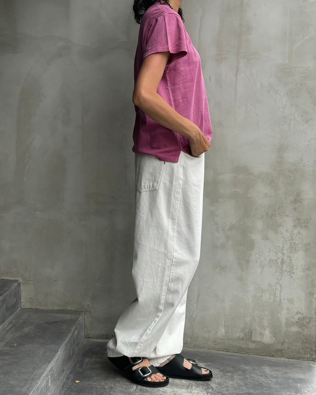 製品染めの商品は独自の色と自然な風合いを持たせるため縫製後に手染めにより加工を施しております。加工製品ですので多少の色ムラ、加工感はございますのでご了承下さい。