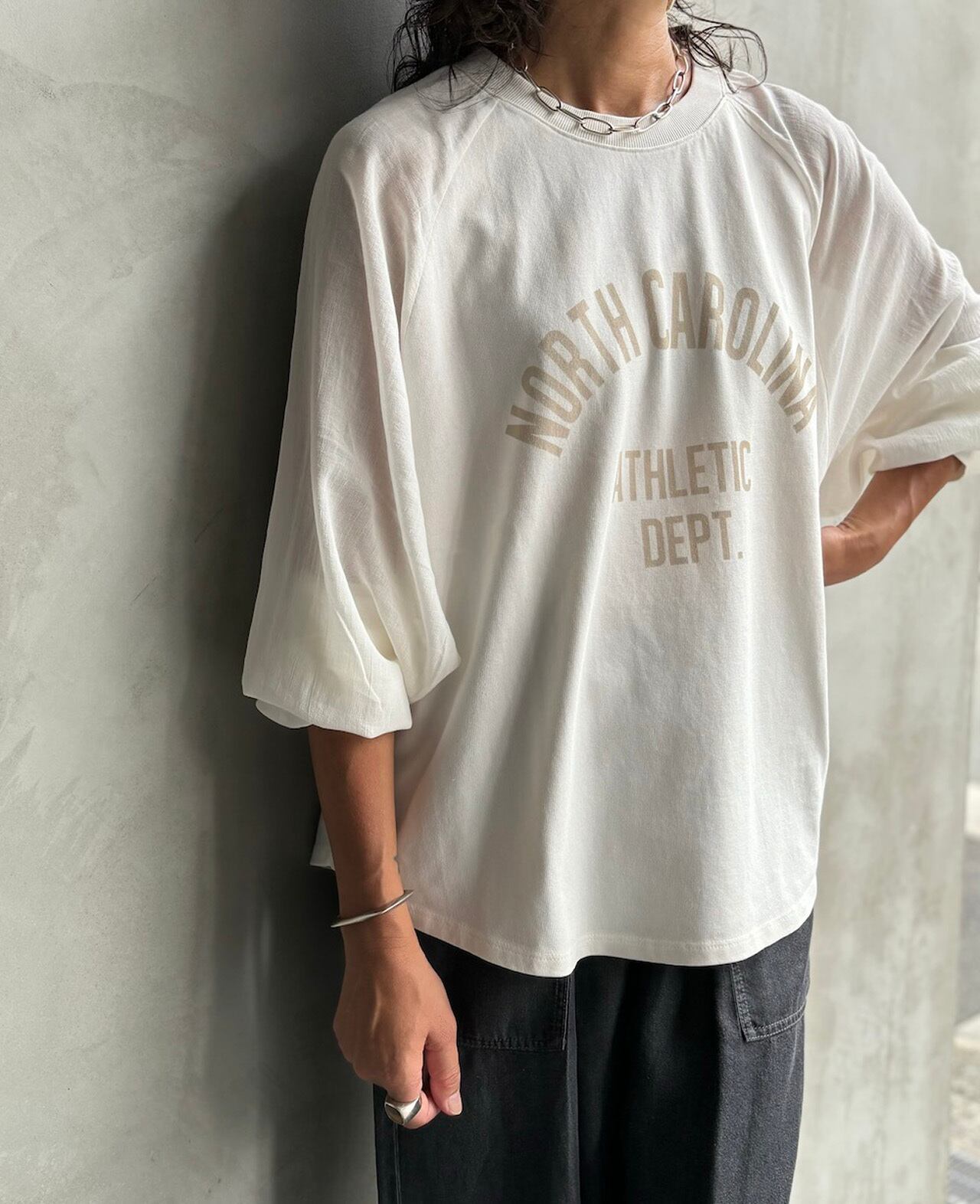 カジュアルなデザインのロングスリーブTシャツを袖をシアーにし女性らしさをプラスしました。