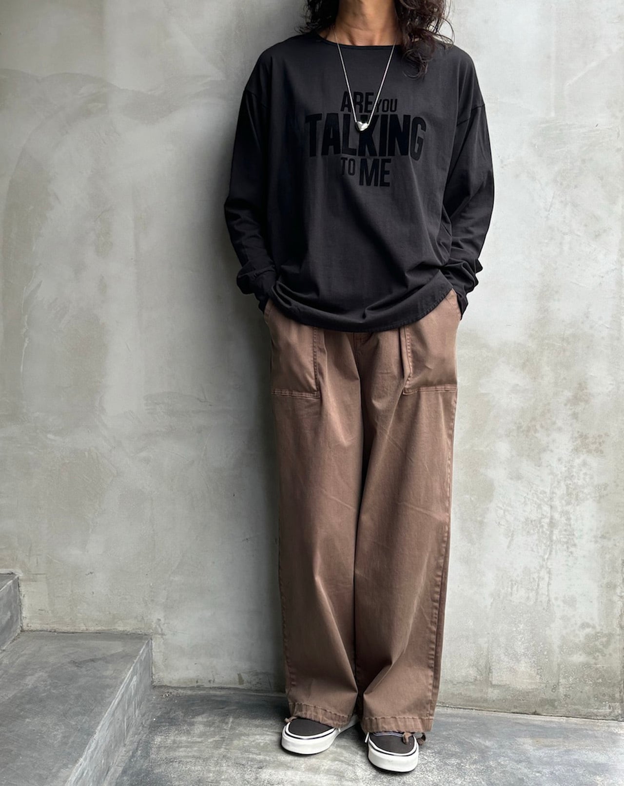 人気のオリジナルロンTのフロッキープリントが登場。暖かみのあるフロッキープリントは秋にぴったりなロンTです。少し厚手で1枚で着ても様になるような仕様にしました。カラーはグレージュ×ワイン、グレー×ネイビー、ダークブラウン×グレー、ブラック×ブラックの4色展開になります。